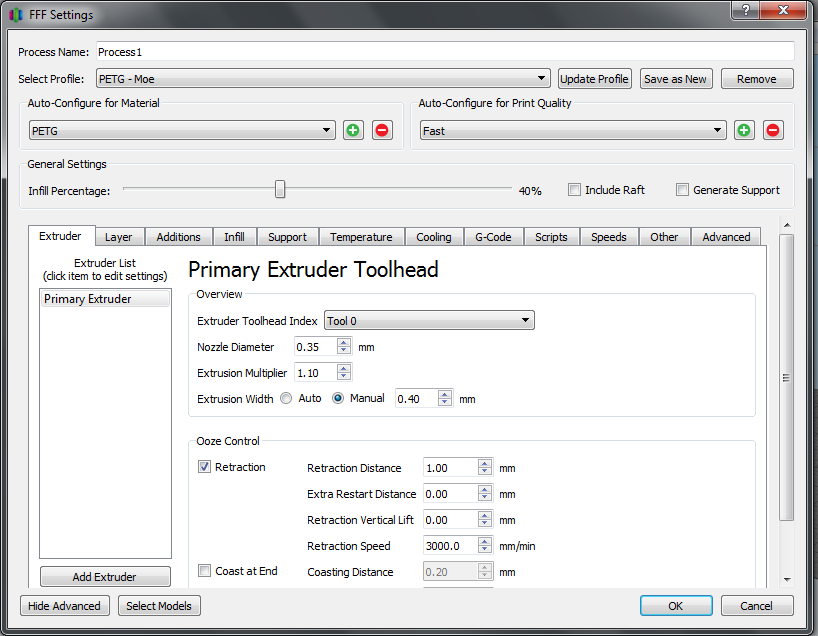 thank you i will try thatiformationFor petG, tool is at 245, Bed is at 110 (only because I don't want to re-level the bed when I swap from ABS for a quick print. Otherwise I think 60 on glass with glue is just fine). Here are the rest of the important information: