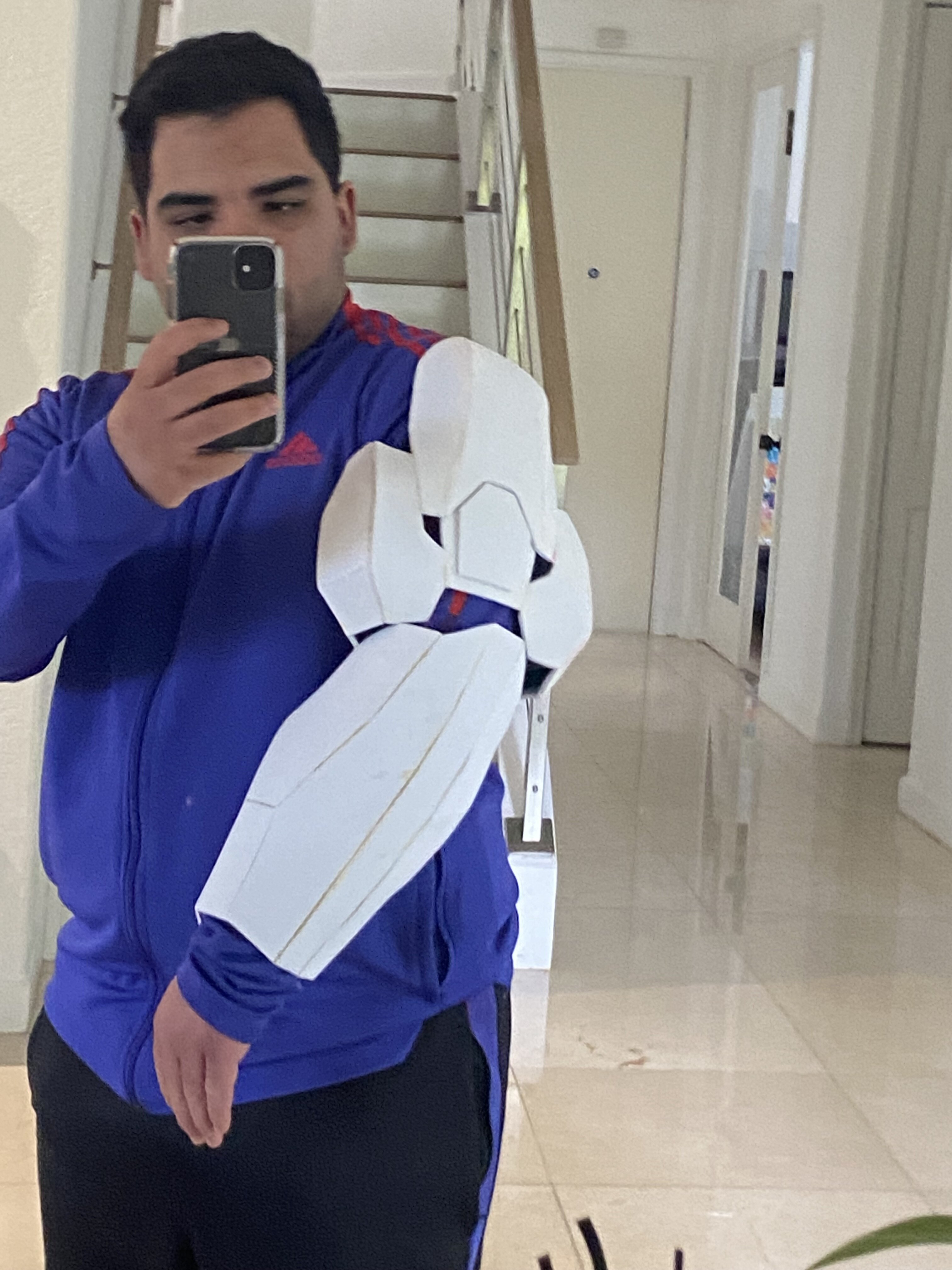 Making pretty good progress. First gauntlet is done and both shoulder pads are complete! We should be done by tonight! Tomorrow we will work on the torso and the back.