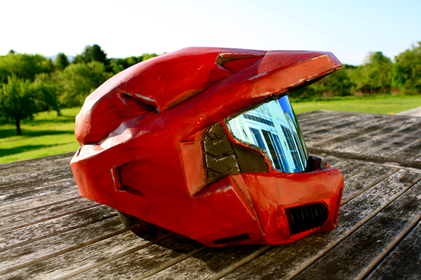 I thought i'd just update you on my visor installation and re-paint of my helmet. I had to have my mark 6 and kat air assault helmet done today to present to some art teachers for a final project, and since I wanted my mark 6 helmet to look more realistic I painted it red and added more weathering. The visor was HOT GLUED into the helmet so it looks really crappy around the edge, it was a rush job so I will probably redo it to make it look neater. Heres the outcome of it all: