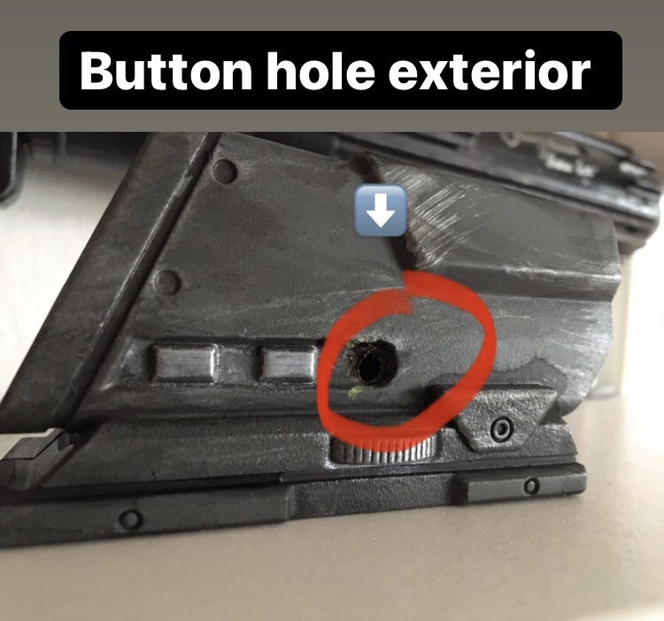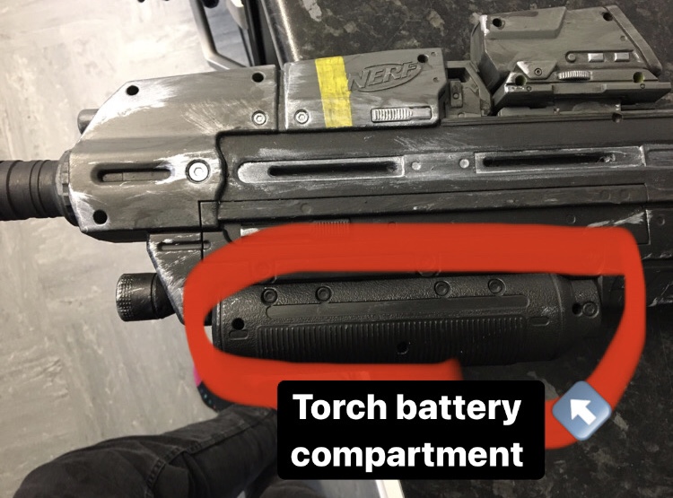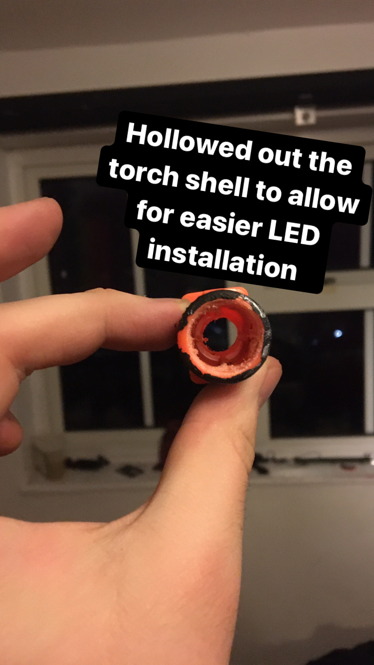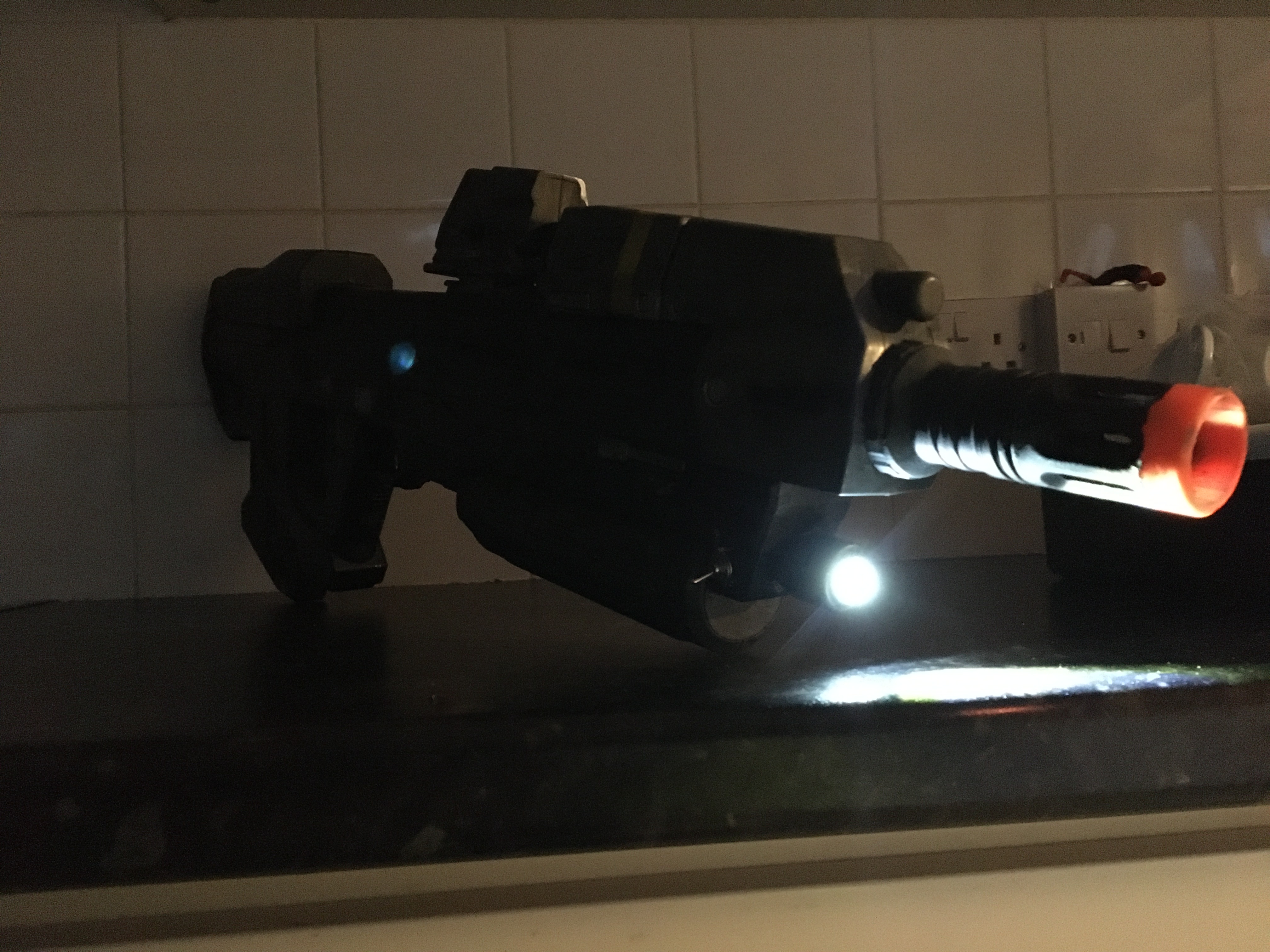 The first thing I did was unscrewed the whole gun so I could gain access to the dummy torch. I removed it, hollowed it out and drilled two holes through the back of the torch. As I had the idea of running the wires through the hole and out to the switch. This ultimately didn’t work out, and I ended up removing the entire back piece of the torch. But I’ll get to that later.