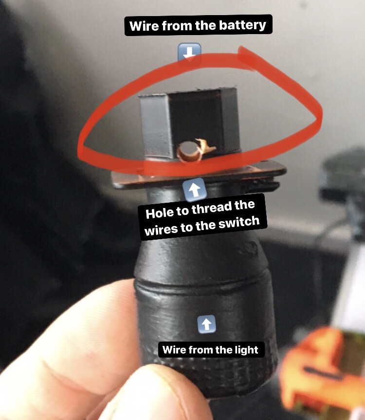 Once I had that done, the circuit began to take form. Battery goes to the switch, switch connects to the light, the black wire from the battery and light connect to one another, thus completing the circuit.