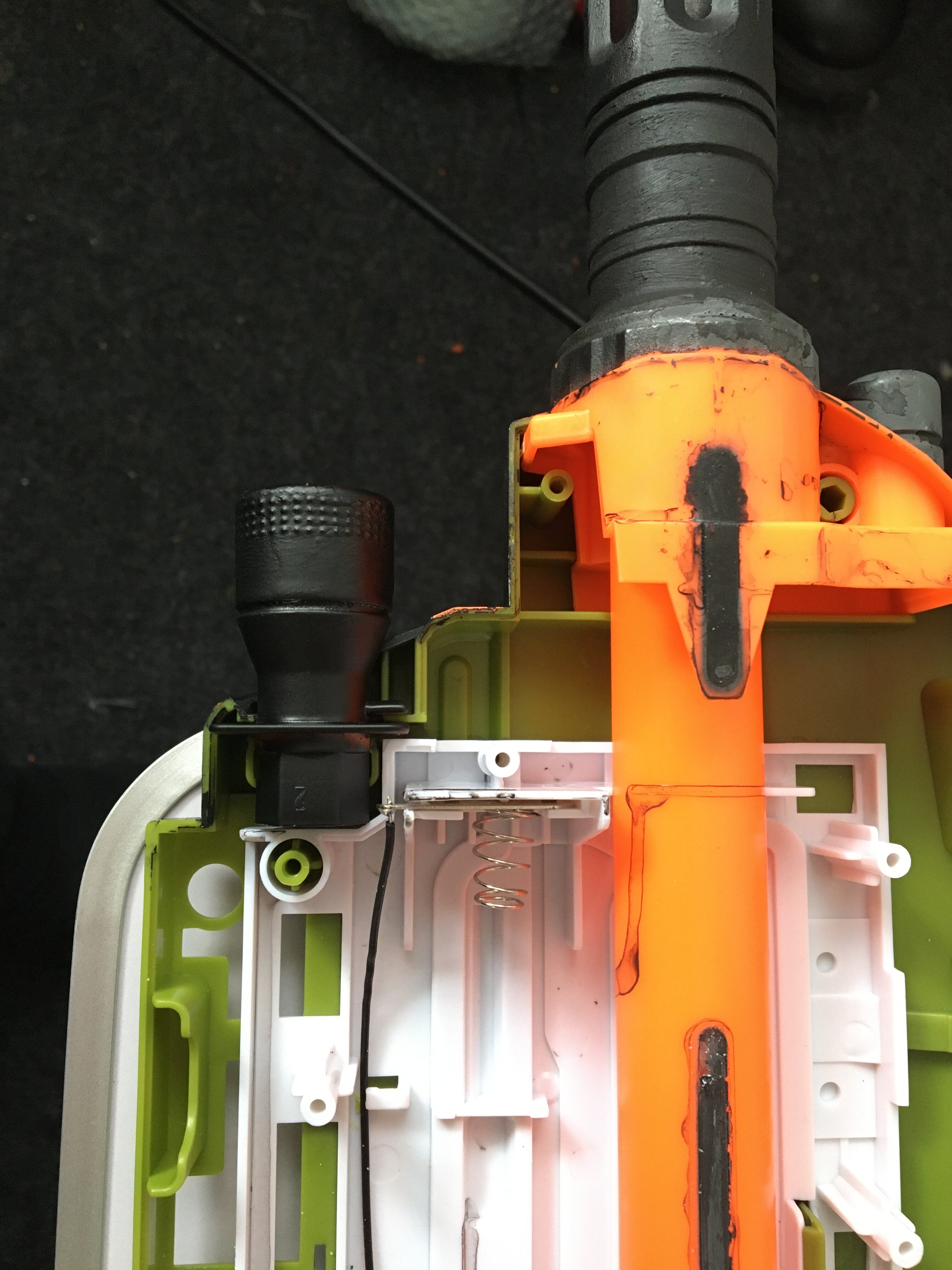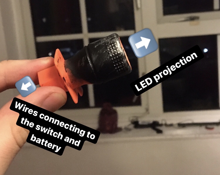 What I was not expecting was how tricky it was going to be to wire up the switch from the inside of the blaster. Because it has that rounded outer edge, it meant I had to first secure that in place, and then wire it up inside the blaster. I connected two red wires to the switch, one from the battery, one from the torch with my soldering iron. This may take a try or two to get right, I know it did for me.