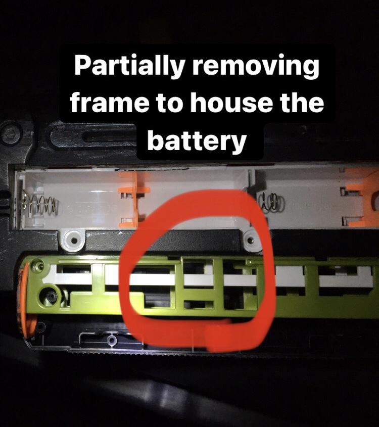 I had planned where the batteries were going to go, which was going to be in the dead space at the bottom of the blaster. So I took my dremel and took out a chunk of the plastic to allow easy access to the battery.
