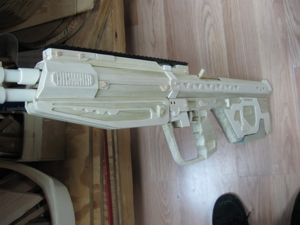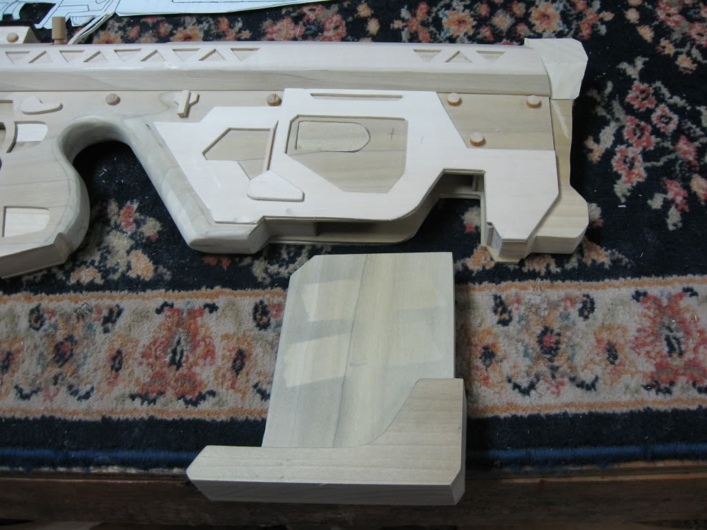 SHE IS ONE. (or mostly) I got all the parts glued up, bought some paints, and rounded out the handle parts. Also made the temporary clip space filler. I didnt have time today to even out all the edges, but that comes tomorrow. I only have to do that, spruce up a few parts here and there, smooth out some things, and paint. I hope to finish this tomorrow by 6-7, might be a stretch, and then its off to gamestop till midnight!
