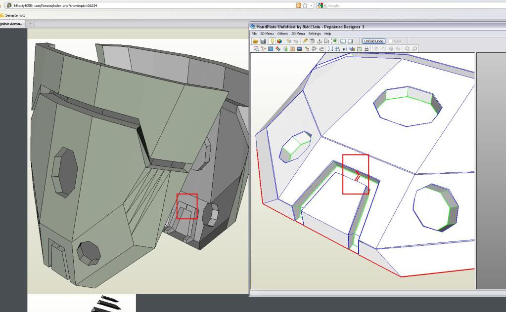 The guy most likely downloaded all the stuff from your thread, seeing how this is the only place (well, kinda) that my hand plate is available. Want proof that it's mine? Here's "his" hand plate, side by side with mine (on the right in pepakura designer), and if it's not enough seeing both designs are identical, he even left in the open edges that were present in my model: