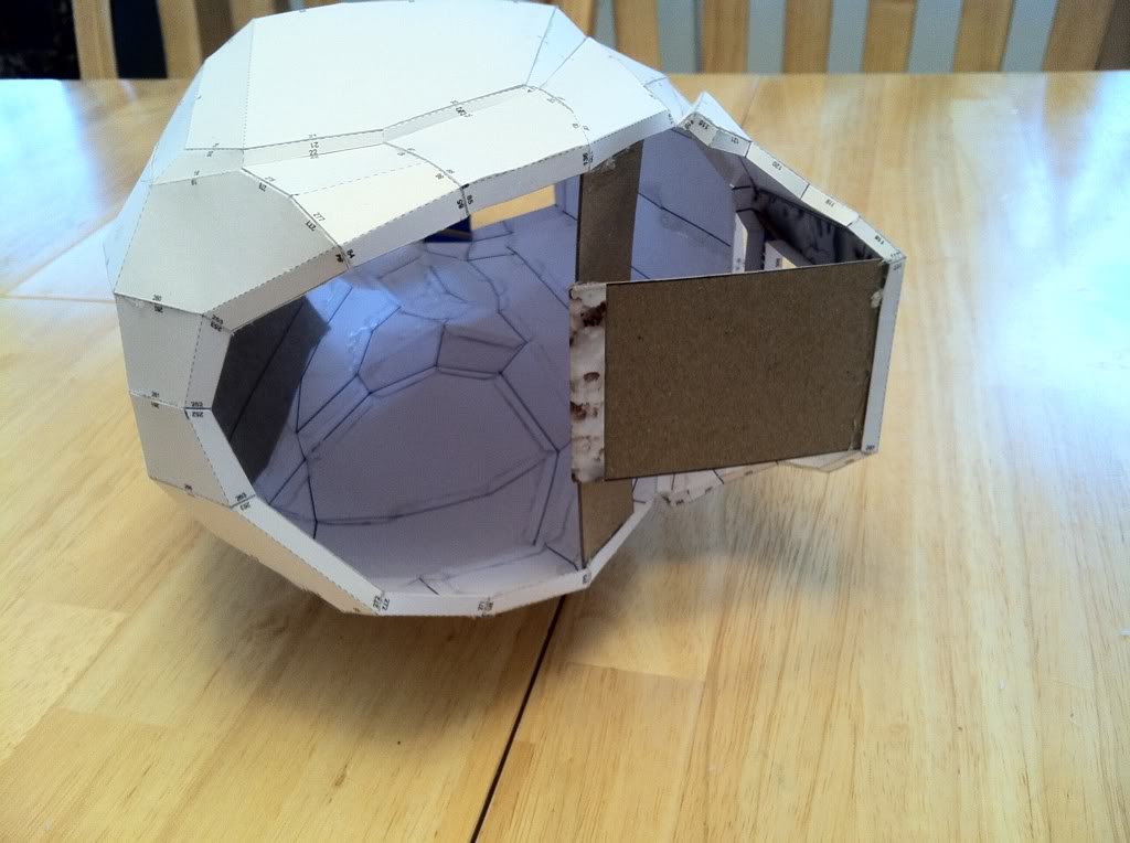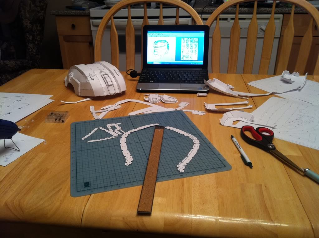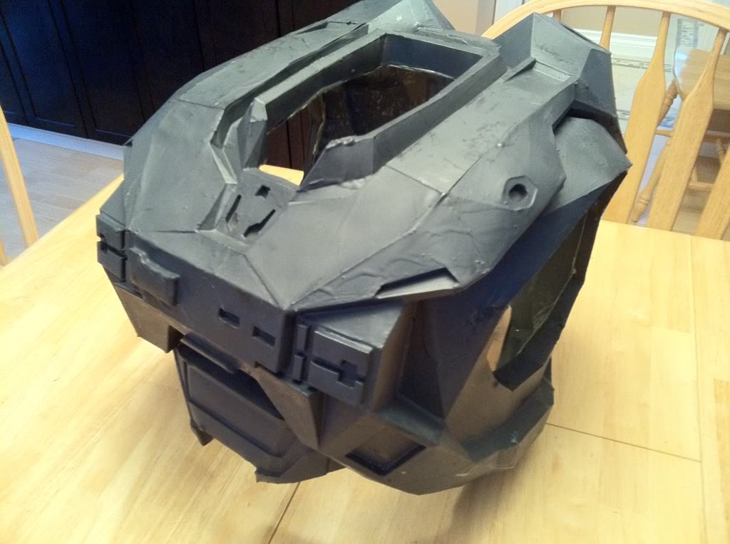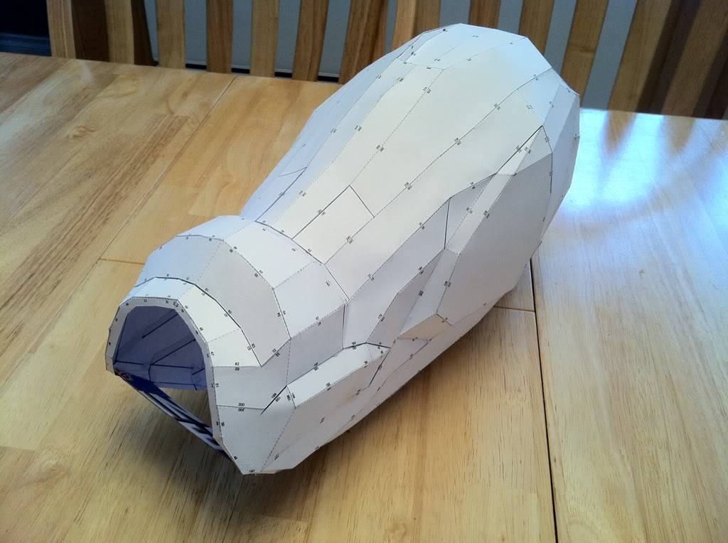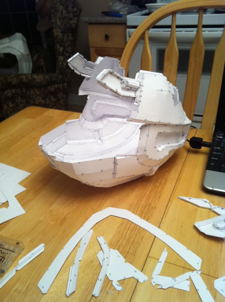 I am happy with how the helmet turned out. The neck hole needs to be trimmed, but there wasn't really any warping and the size is pretty good. It is built at a height of 28cm the default size for te file. It went together pretty well. There were some tough areas, lots of little folds, but I didn't really have to use any cardboard to keep things flat. Enjoy!