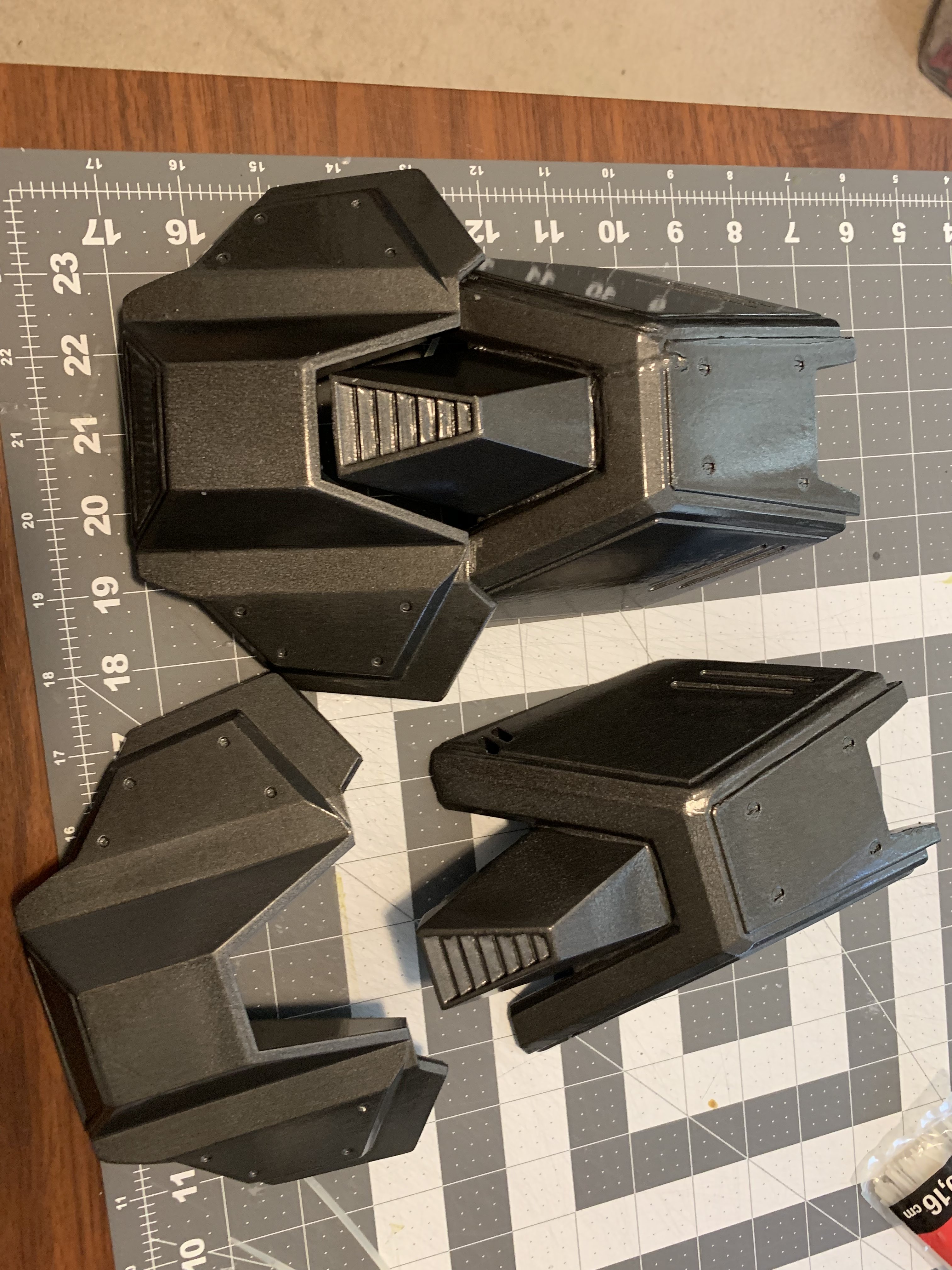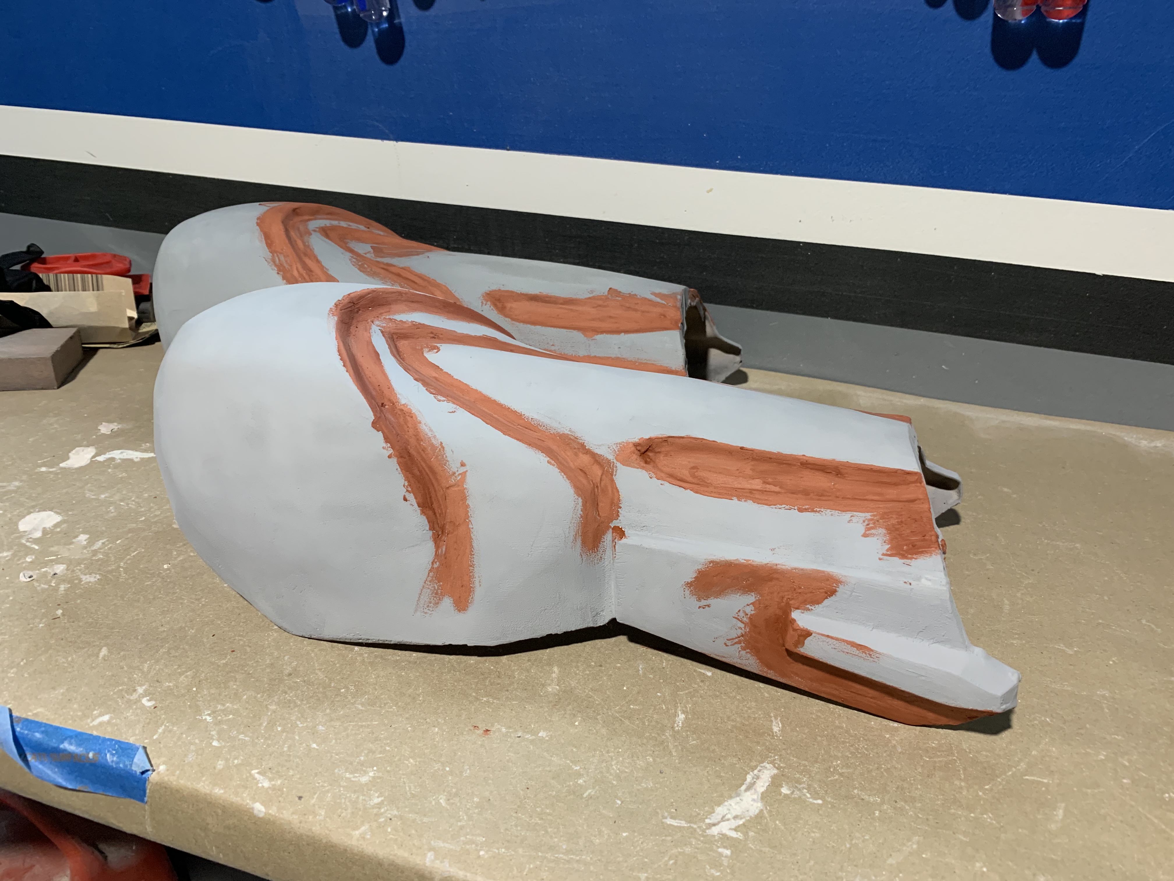 Getting really close to assembly time. Shins and knees are down to spot putty to fill in small areas that aren't quite where I'd want them. I plan on 3d printing some new knees this weekend to get a little better fit, but a v1 of every outer armor piece will be ready by then. Game 7 of the Stanley Cup is tonight, so depending on how things are going I plan to spend intermissions working on the inner chest.