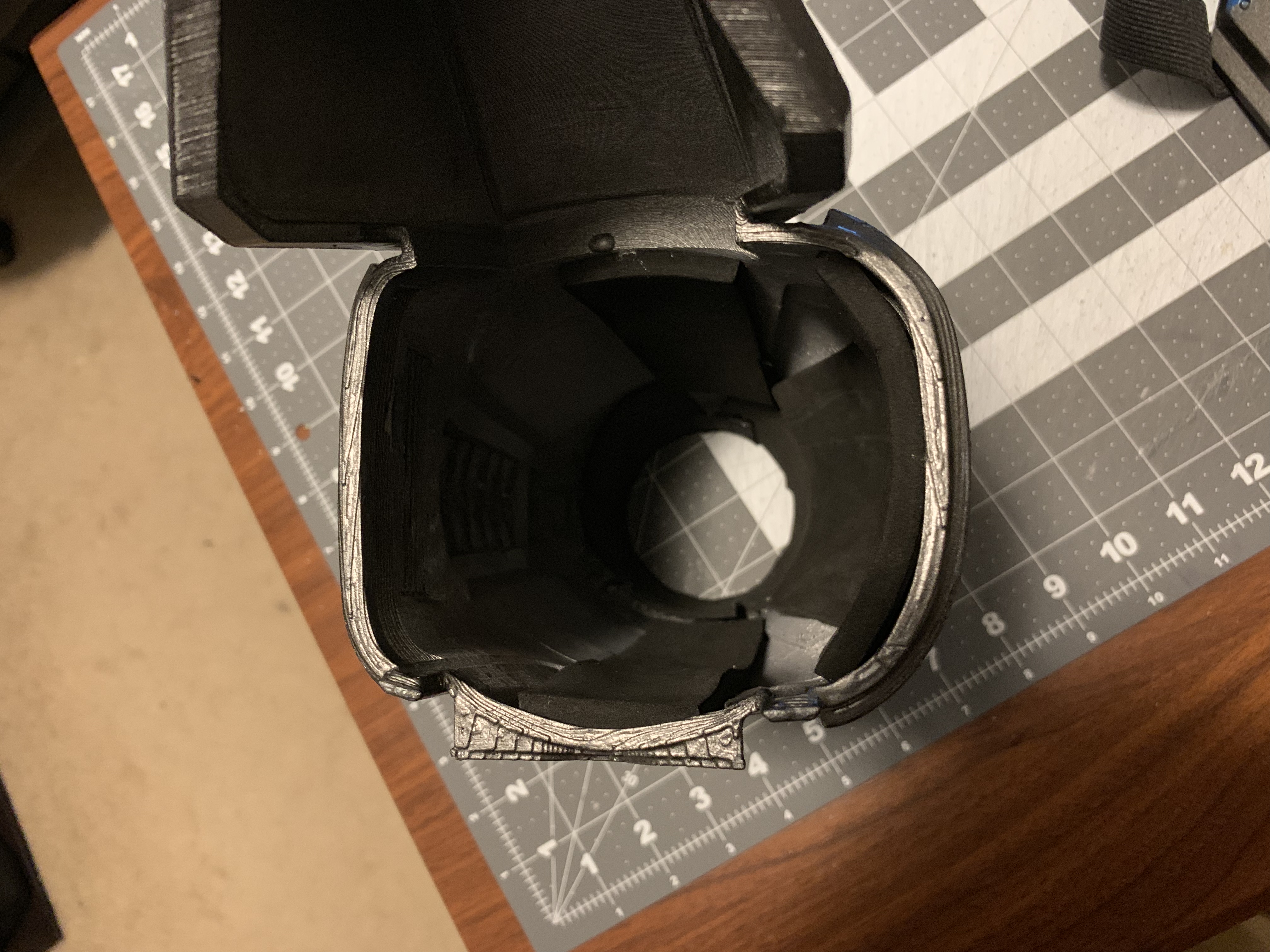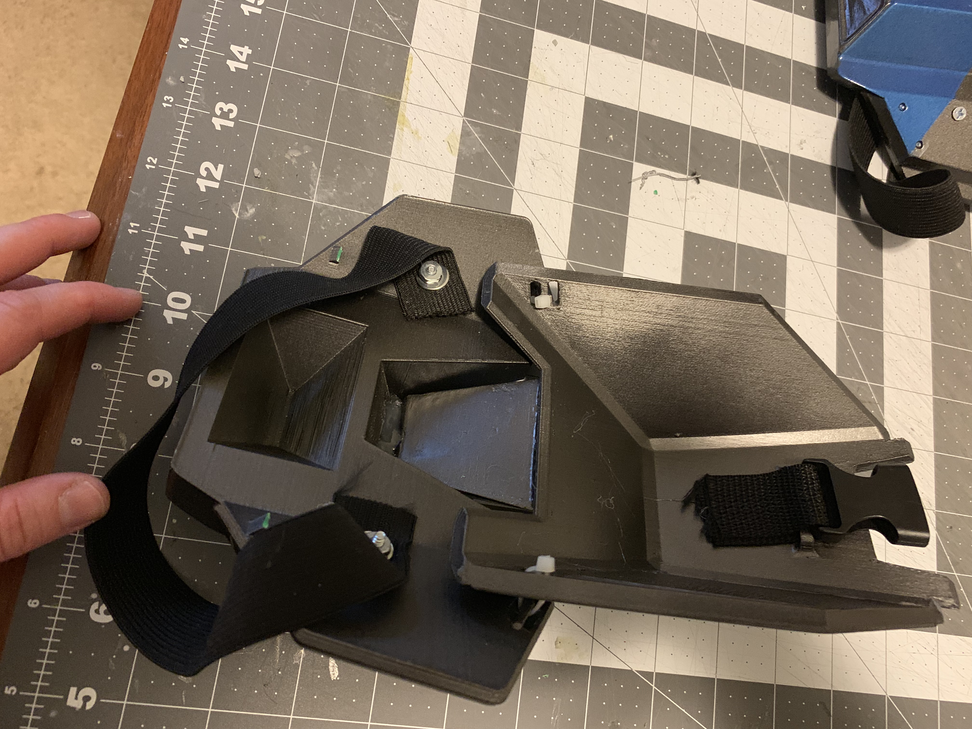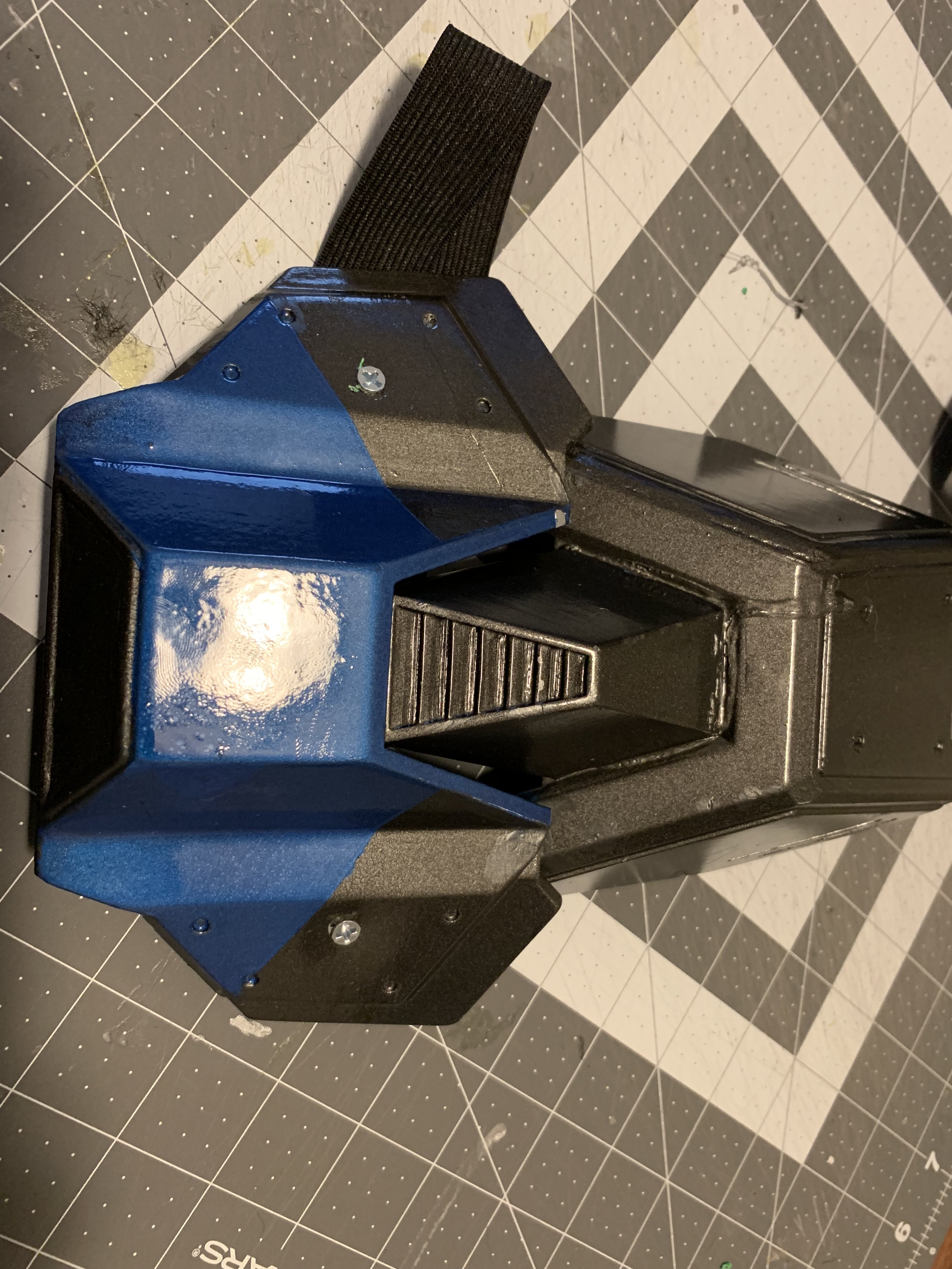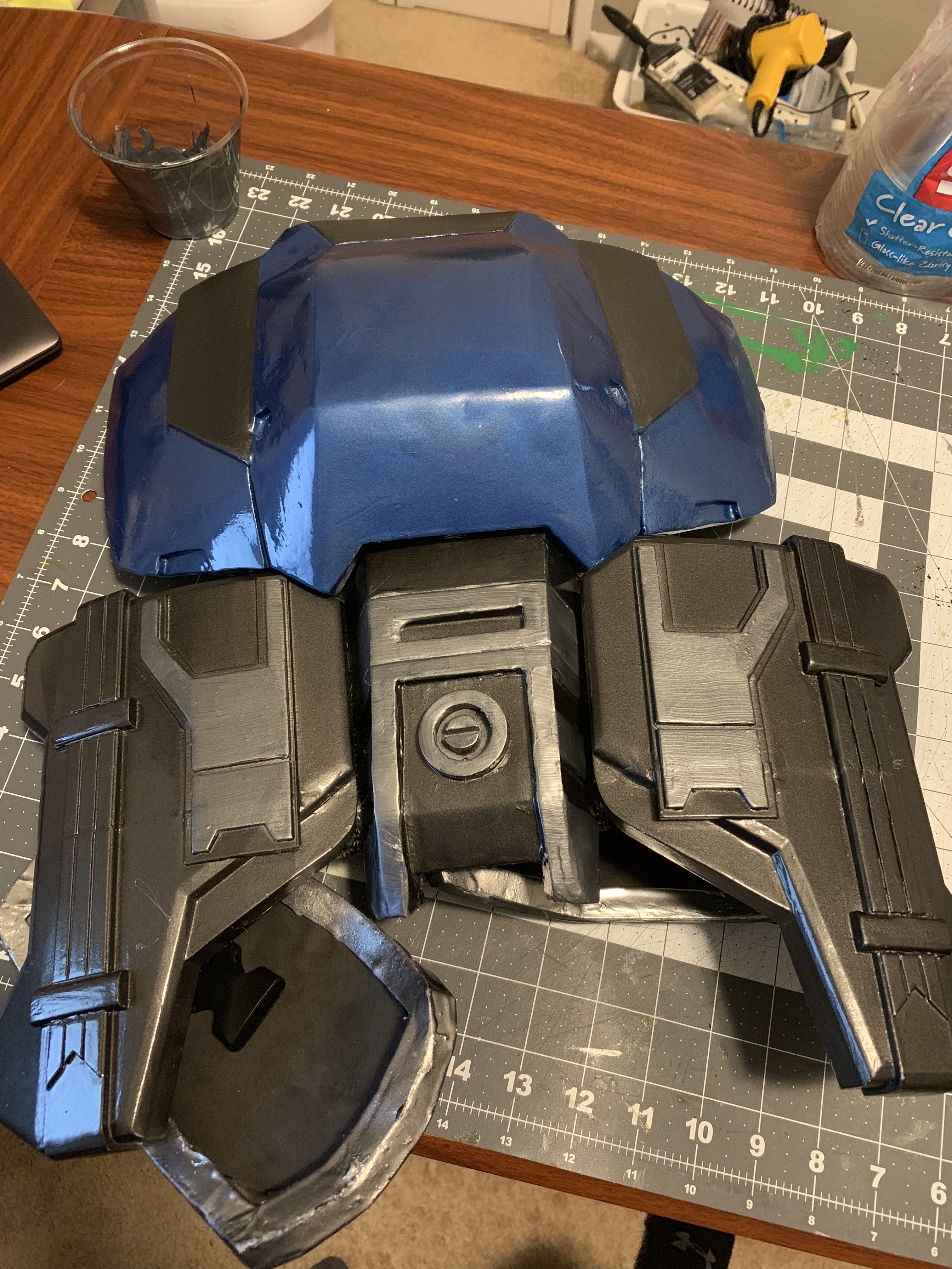 - Helmet: Painted, padded, possibly add more padding to prevent slipping or a chin strap, add fans if time