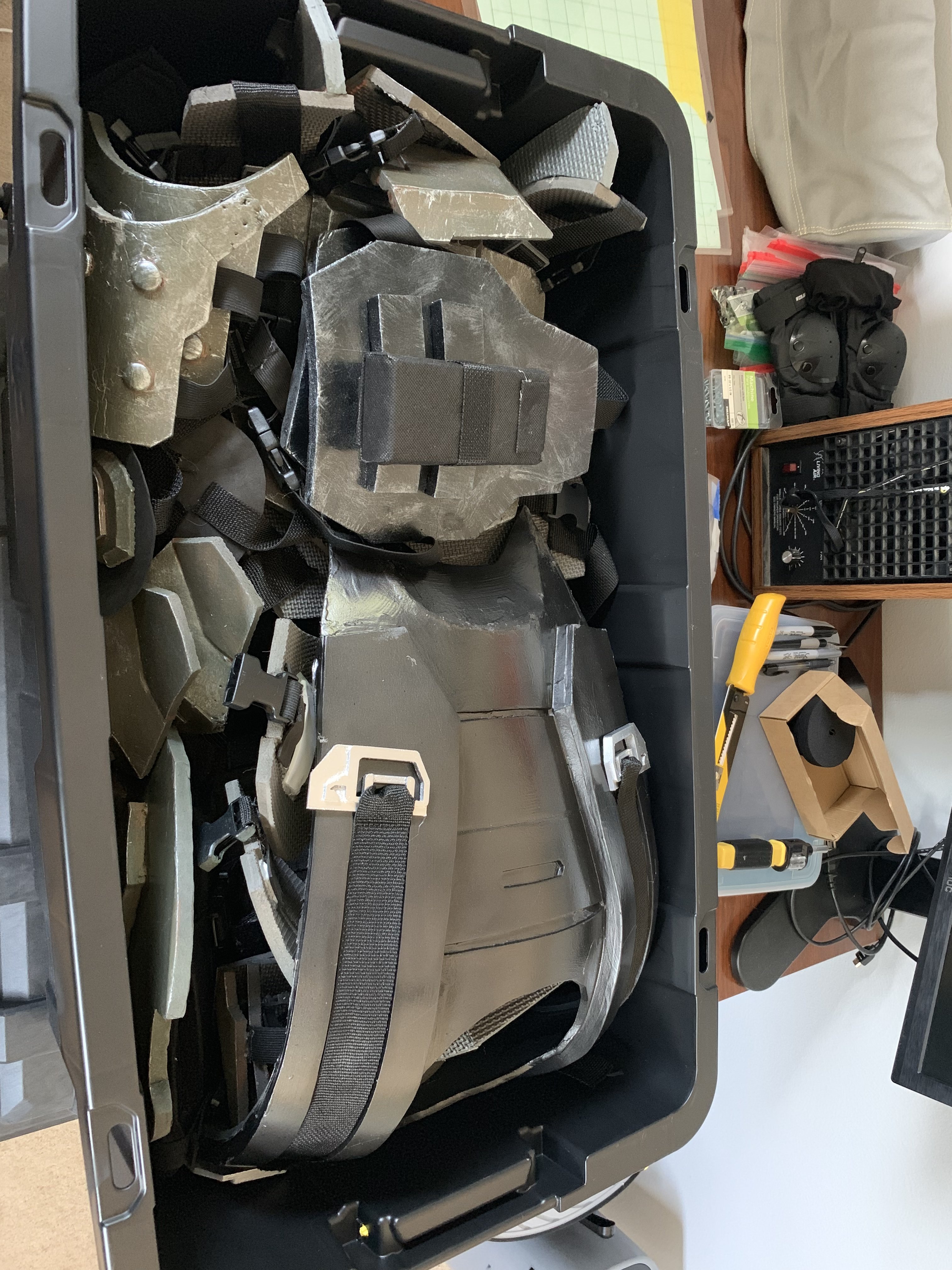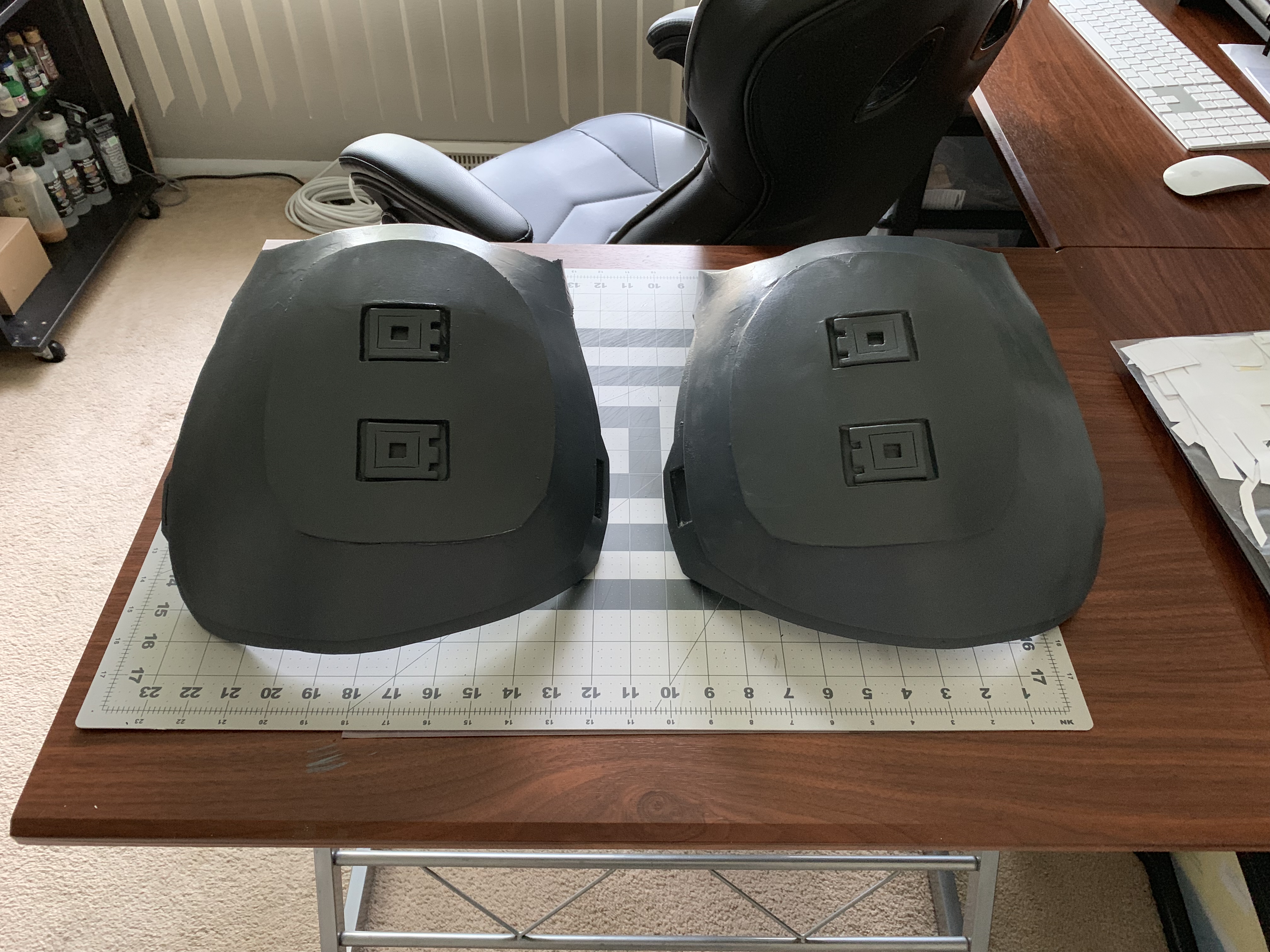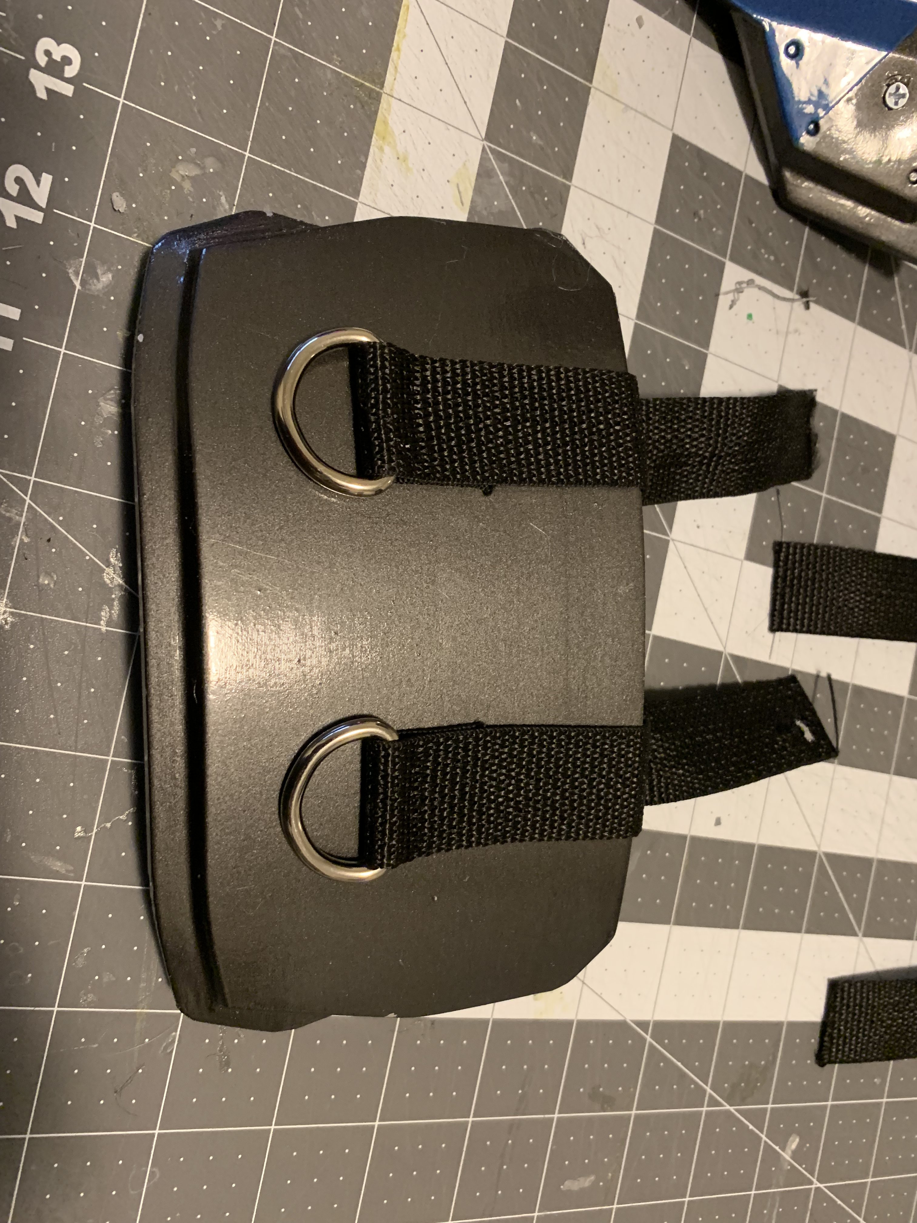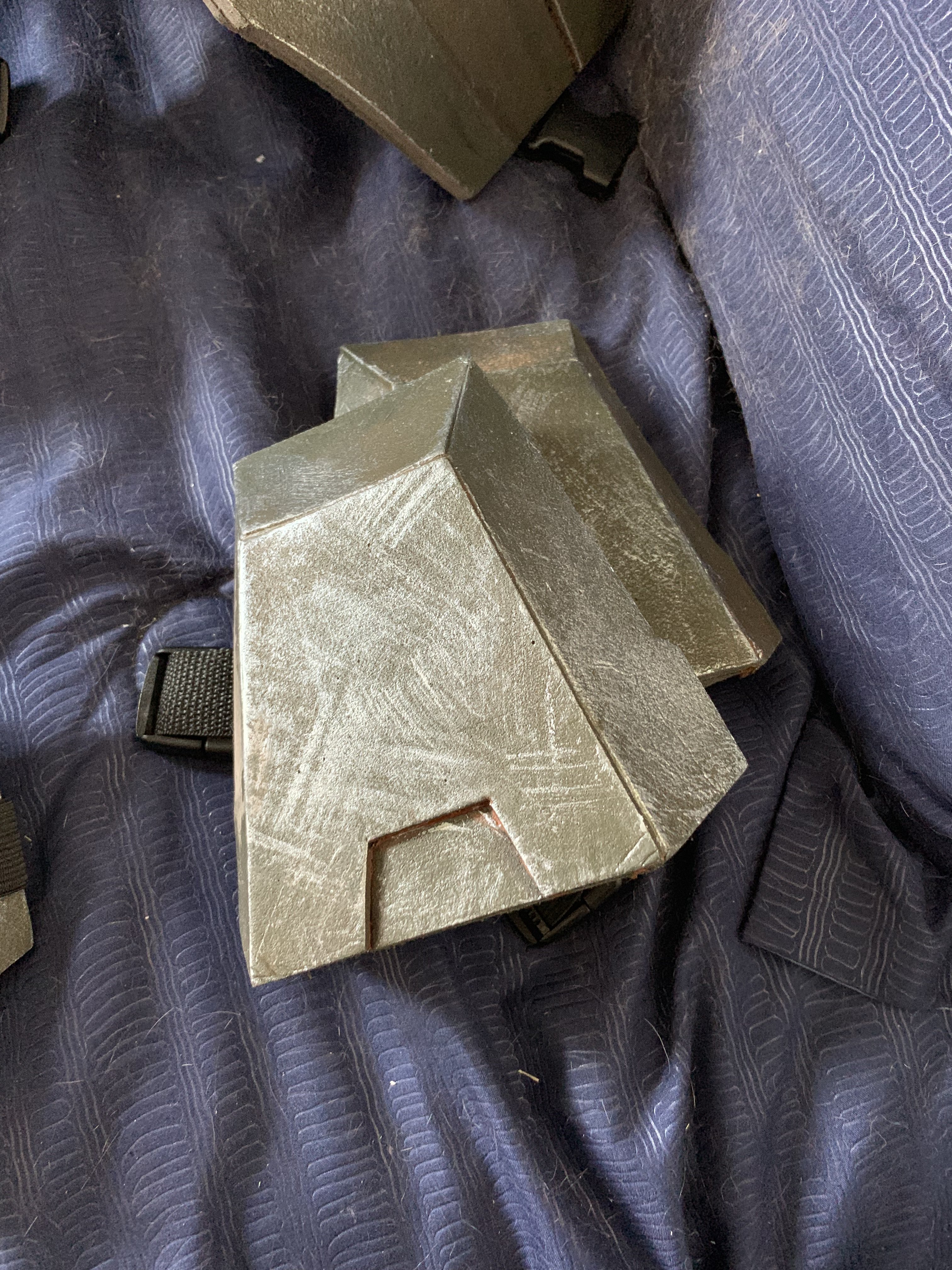Over the past two evenings I cut down the thigh plates and sanded the edges. I'm going to seal the now sliced edges tonight before testing straps and painting.