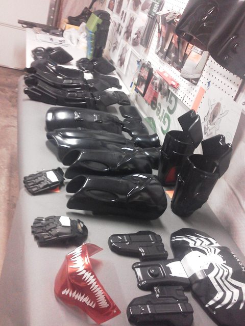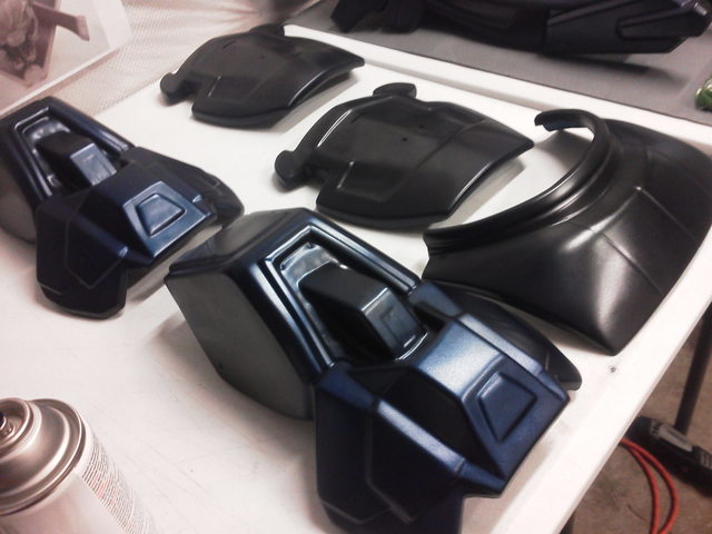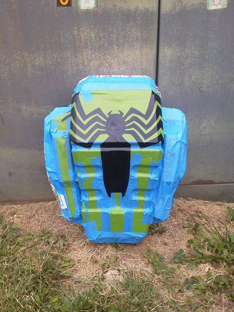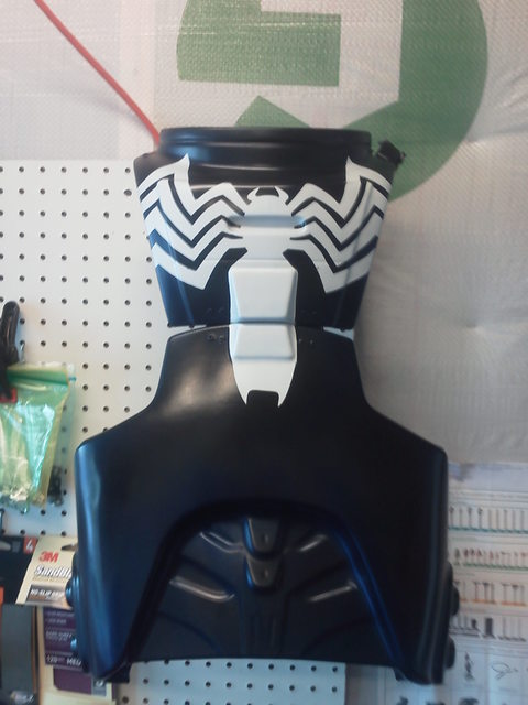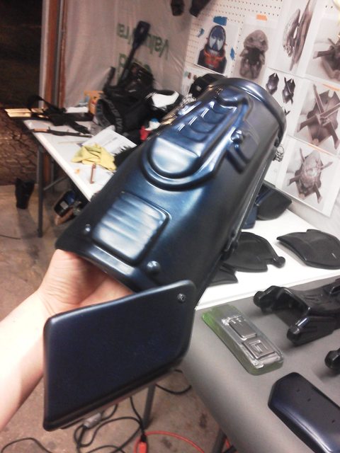 The sections are connected with strips of nylon webbing that's been riveted to the plates. Sean recommended to use scraps of the HIPS material, but I think I may not be the only one wearing this (especially when I get the Carnage suit done)so I opted for the flexibility instead. It still feels very solid. I'm not worried abou it tearing.