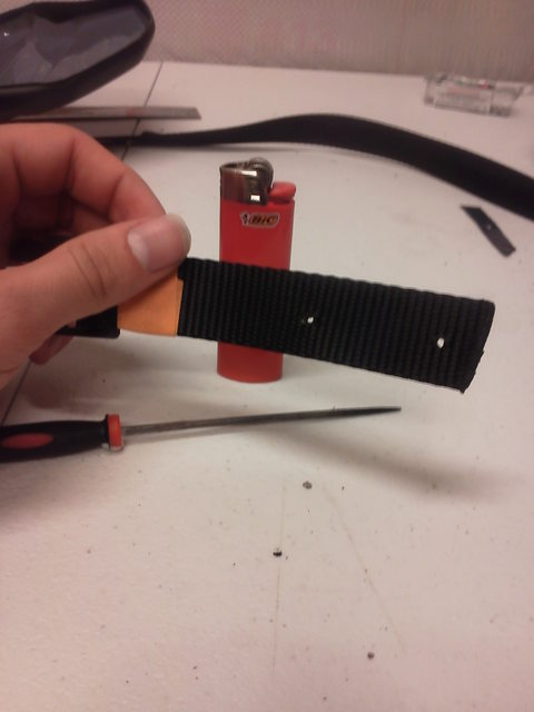 I found that an easy way to make the holes in the webbing for the rivets to slide through was to heat a file I had with a lighter and poke it through. This works better than a drill or dremel in my opinion because the nylon has a tendency to catch or dethread if the right amount of speed and pressure are not applied.