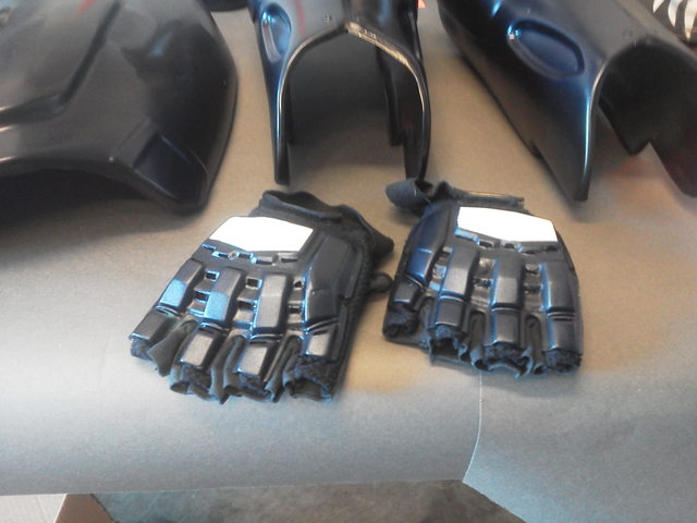 I also got the gloves painted. They are just some old paintball gloves I had around. I need to remove the old velcro strap and sew in a new one.