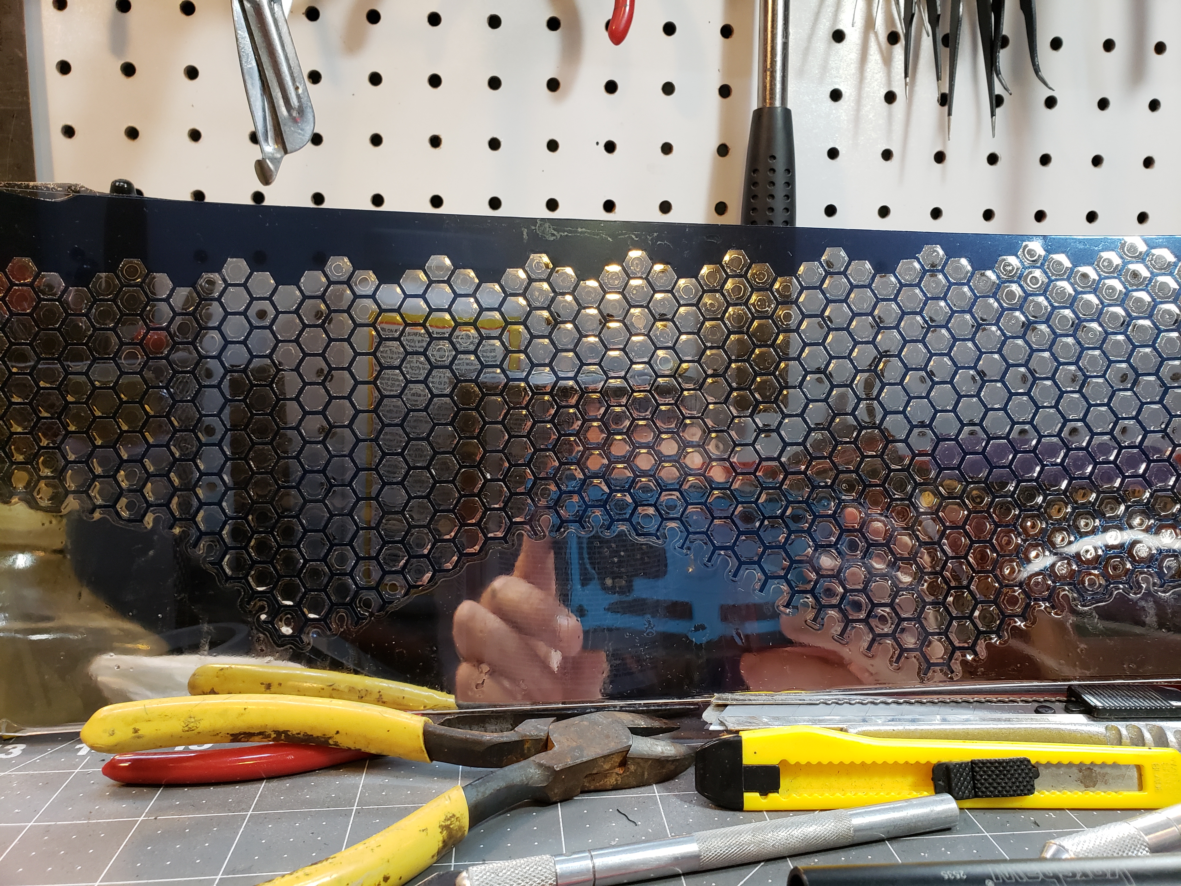 Just for reference, here is a pic of the silver with the blue hex outline. Only problem with this was that the two films had to be layered on top of each other versus one on each side. That left air pockets in each hex cell and when formed, it created a headache inducing kaleidoscope effect. You can see what I am talking about in the upper right part of the pic.