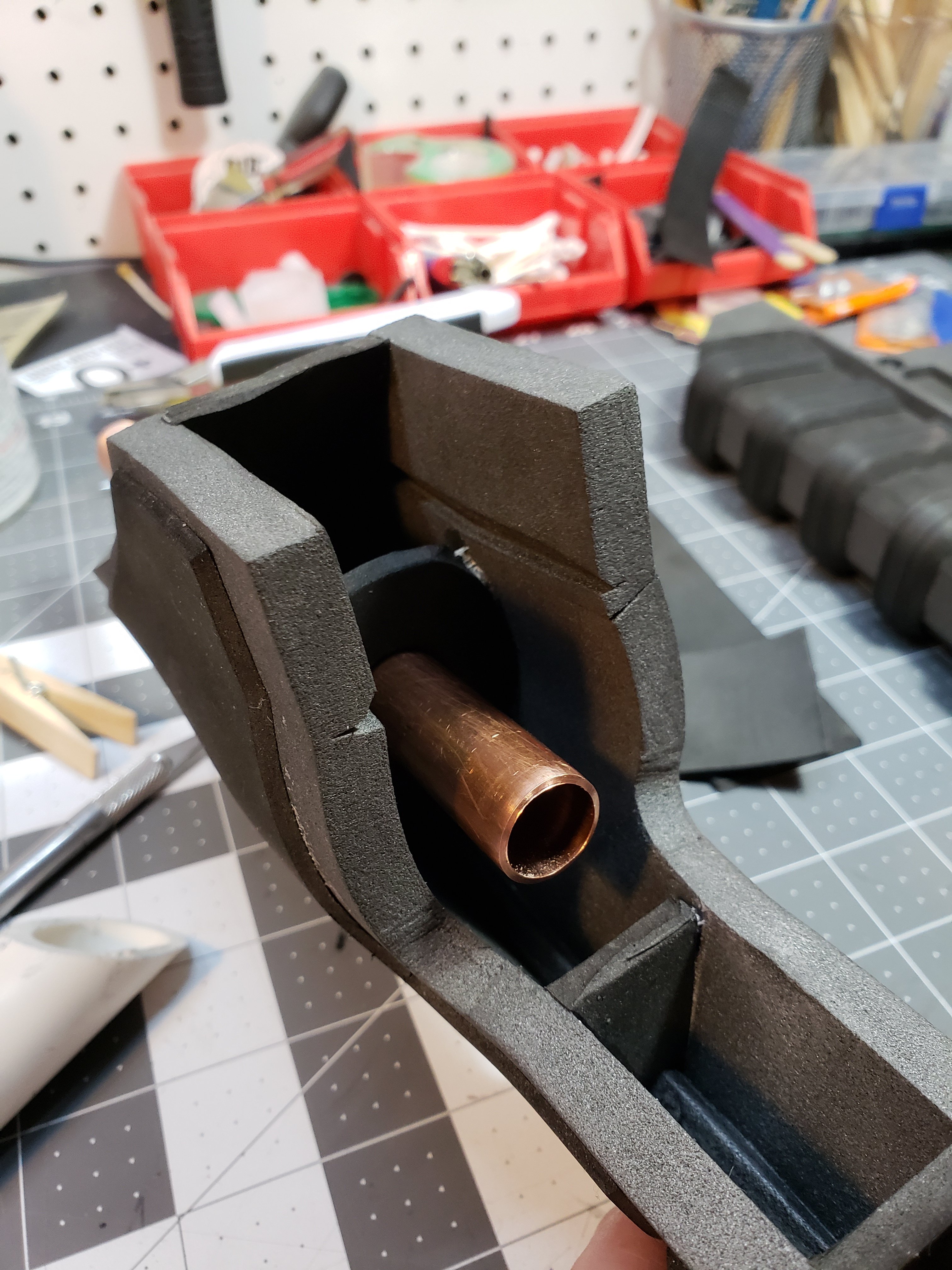 Super strong magnets inside the armor?About midway through the rifle build the thought had crossed my mind, but I opted against it. I did do that for my son's magnum and thigh pieces. I put magnets on both sides of the magnum and one each in the thigh pieces. In a static environment, it worked flawlessly, but as soon as the dynamics of him walking in the armor went into effect, the magnum would slide off. I ended up engineering a shelf system for the muzzle to sit on and it worked fairly well, but any moderate bump and the magnum would fall off.