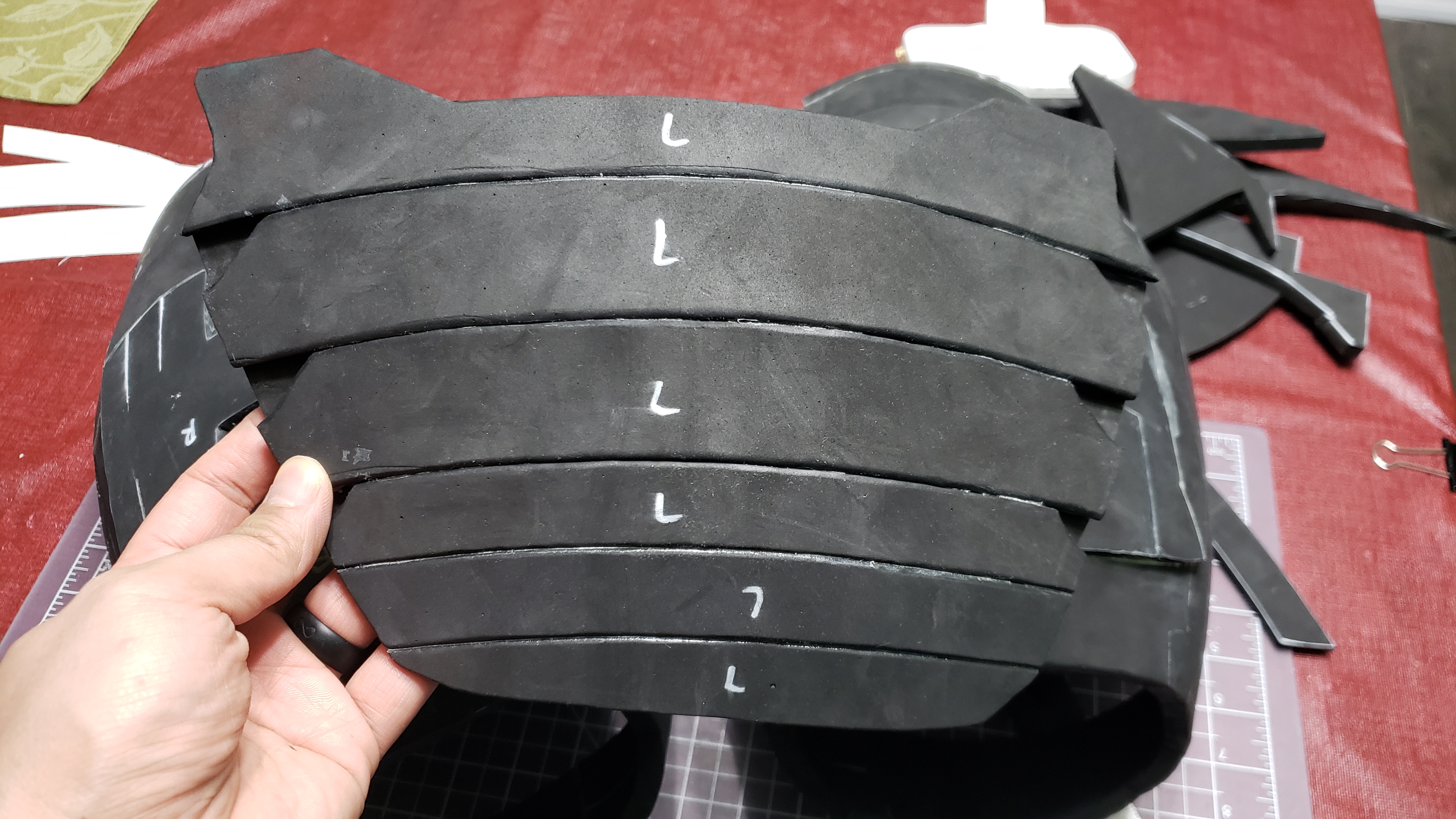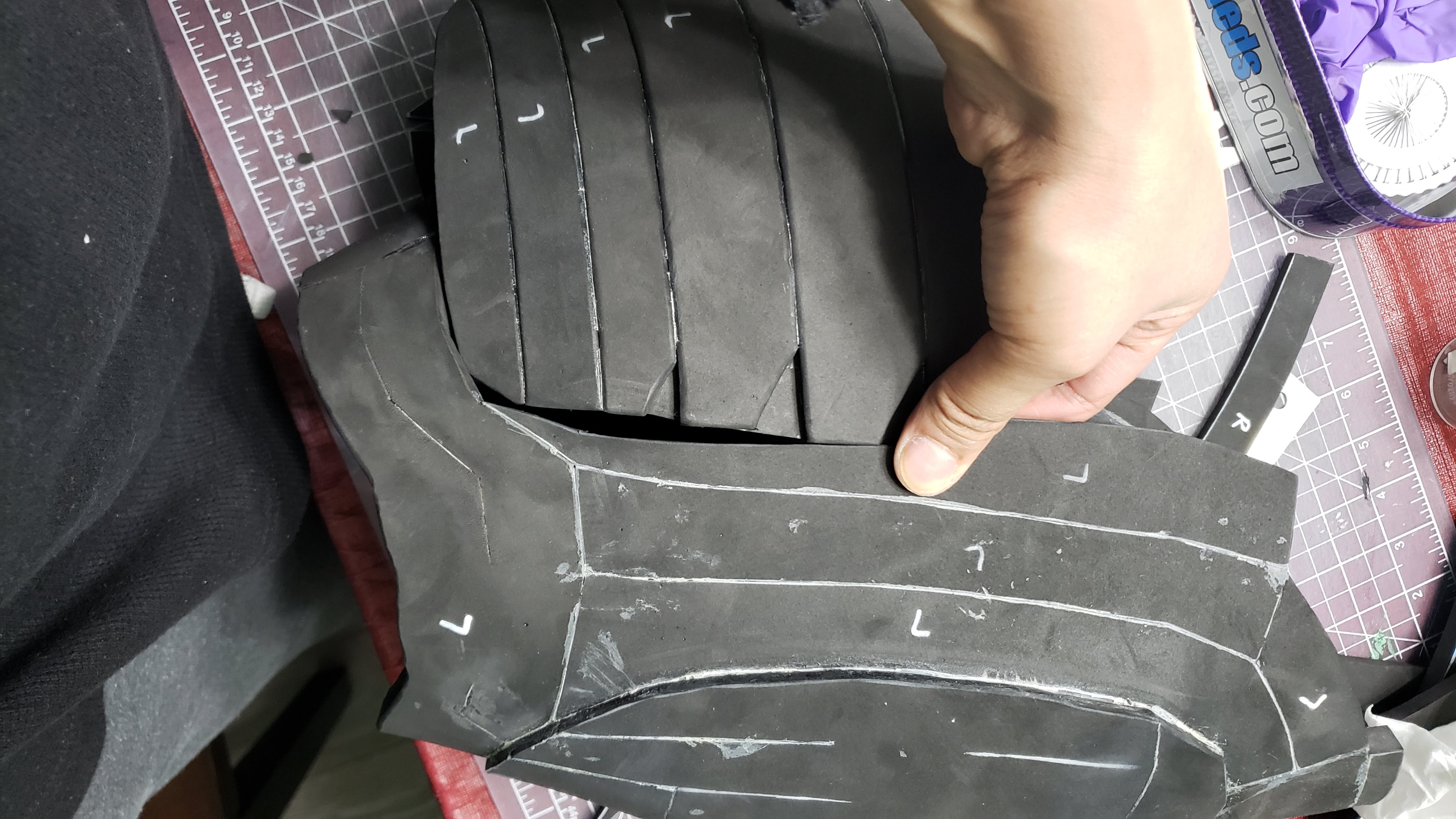 To tell the truth I just guessed. I knew the angles were between 45 and 90 degrees. So when cutting my bevels one part had a bevel of 45 (roughly 1/4 inch) and then other side I would measure 1/8 inch and it works out.Great work on the shoulders. I'm struggling a bit with my own... any tips for getting the right angles? I've been trying to interpret the edge angles that Armorsmith gives you but it doesn't really make sense to me.