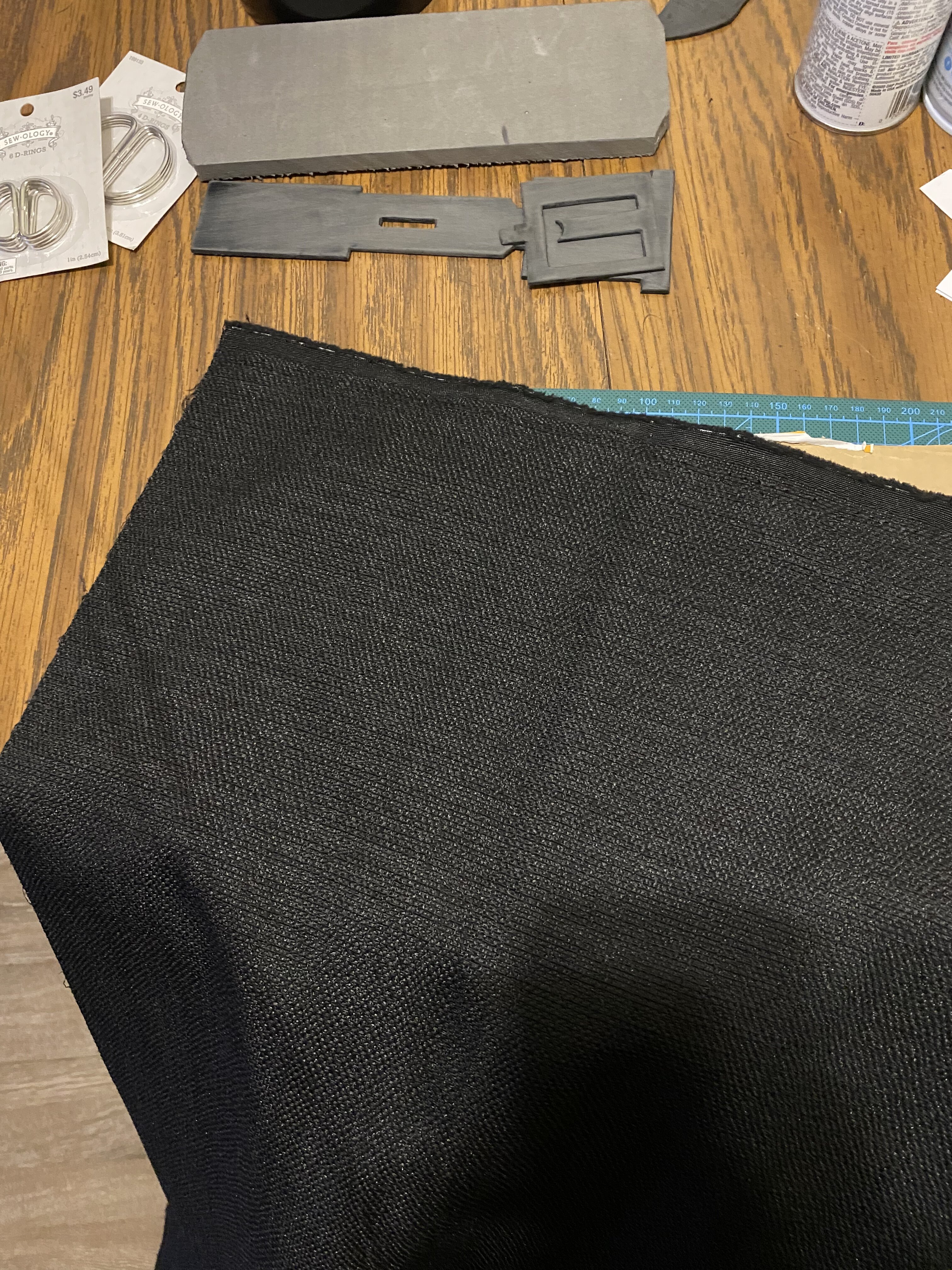 Found a suitable material for the belt buckle body and parts of the abdomen plates. It’s black linen I picked up at Hobby Lobby. Also got the buckle itself mostly finished. Just gotta do the details on the left side, curve it to my belt, and paint