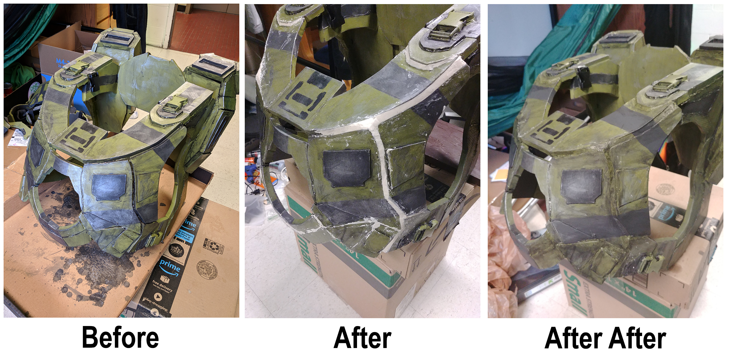 Today I spend the past few hours applying paper clay to the chest! I made sure that the front chest piece was connected to the back, since it bends a little when snapping the two pieces together. This way, it'll also hopefully hold its shape because of the clay filing empty spots and restricting it from bending back! Now enough talk, here are some progress photos!