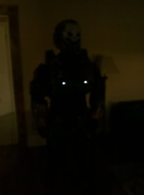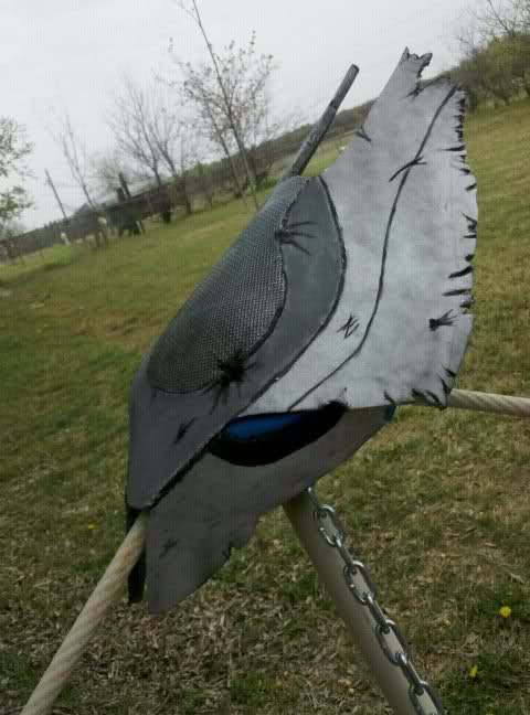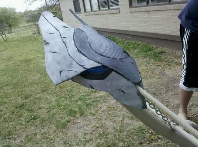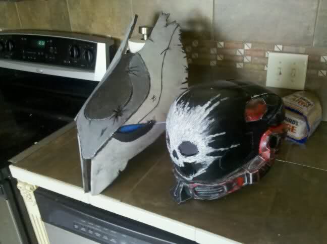 I do plan on making a more weathered look and feel to it, so it is not nearly done, I'm stuck on either finishing the full helm around or since I'm not going to be wearing it, leave if open in the back and just glue it on, which is another puzzle! PLACEMENT! I know either forearm or back just can't decide which would look cooler! and the blue in the eye holes is simply painters tape I thought looked cool lol