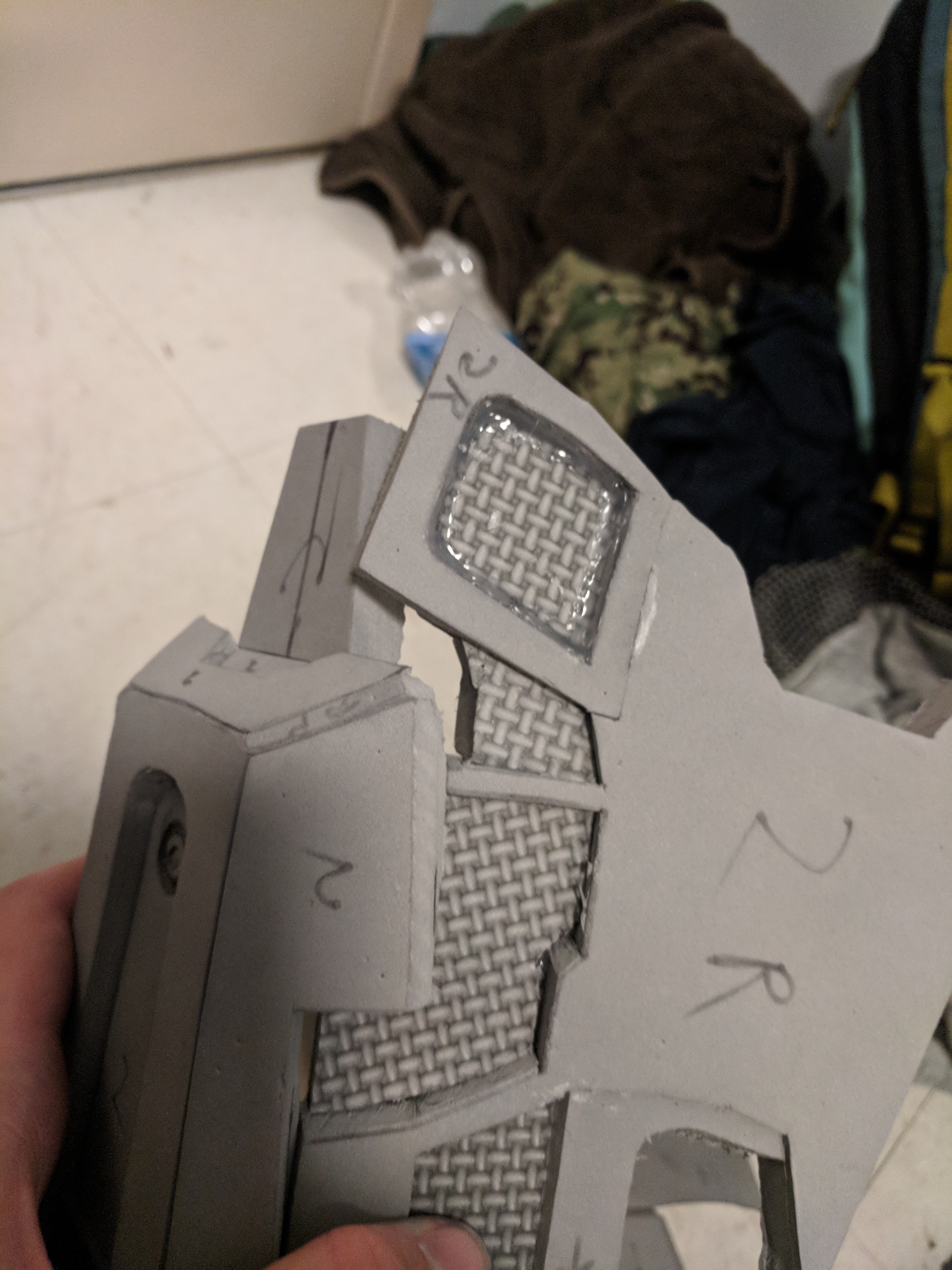 Also another thing I tied out which worked well, was scoring the foam on two bits that we're flush with each other. The hot glue likes to fill the gaps between, so in a flush piece, it will hold it together better than the two smooth surfaces.