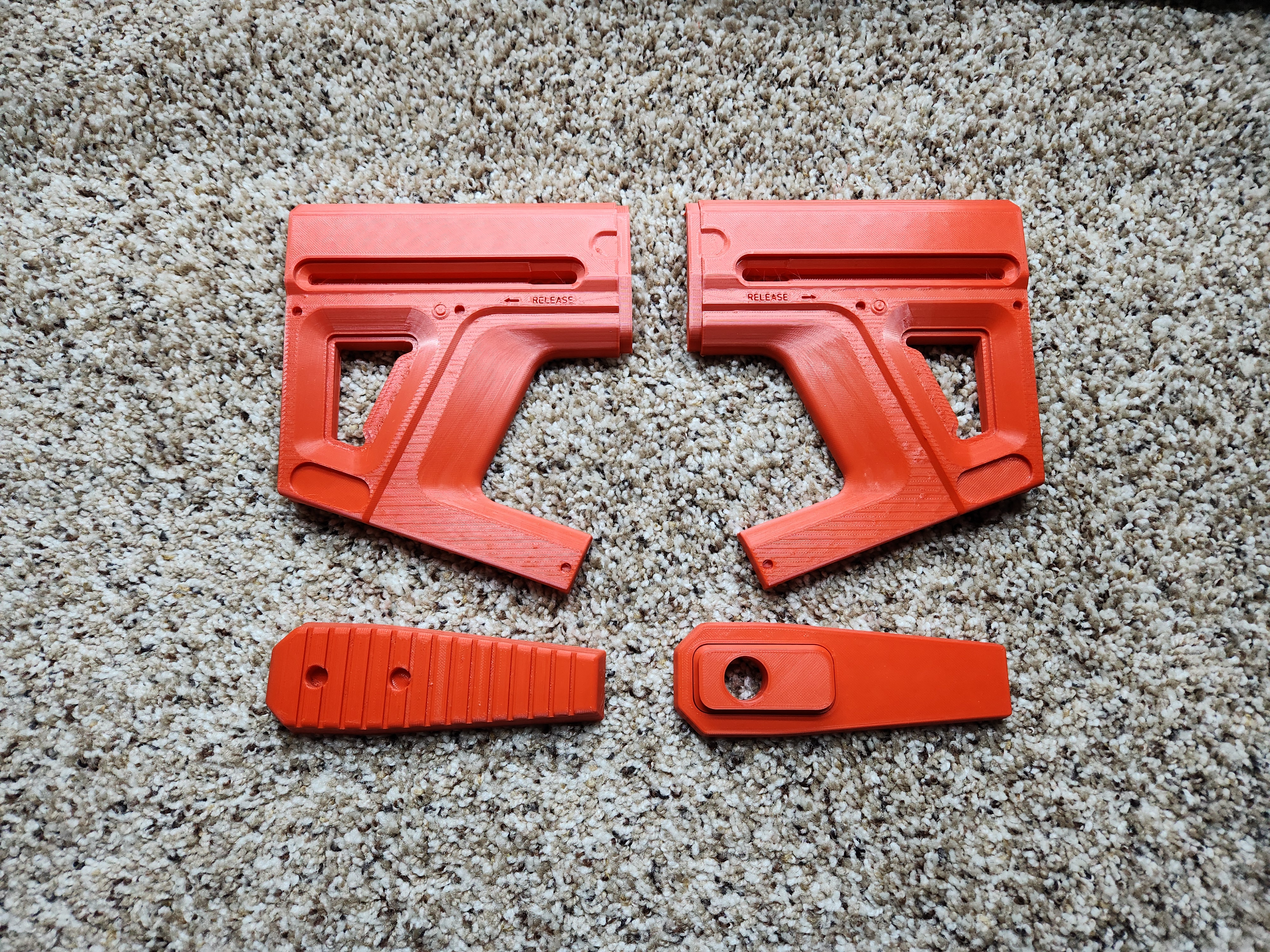 I then used JB Weld plastic epoxy to attach the greebles and the parts together for the ammo counter and piece opposite of that. Next I used acrylics to touch up on any imperfections on the hydro dip. I made sure to tap the paint on to give it some pepperoni texture.