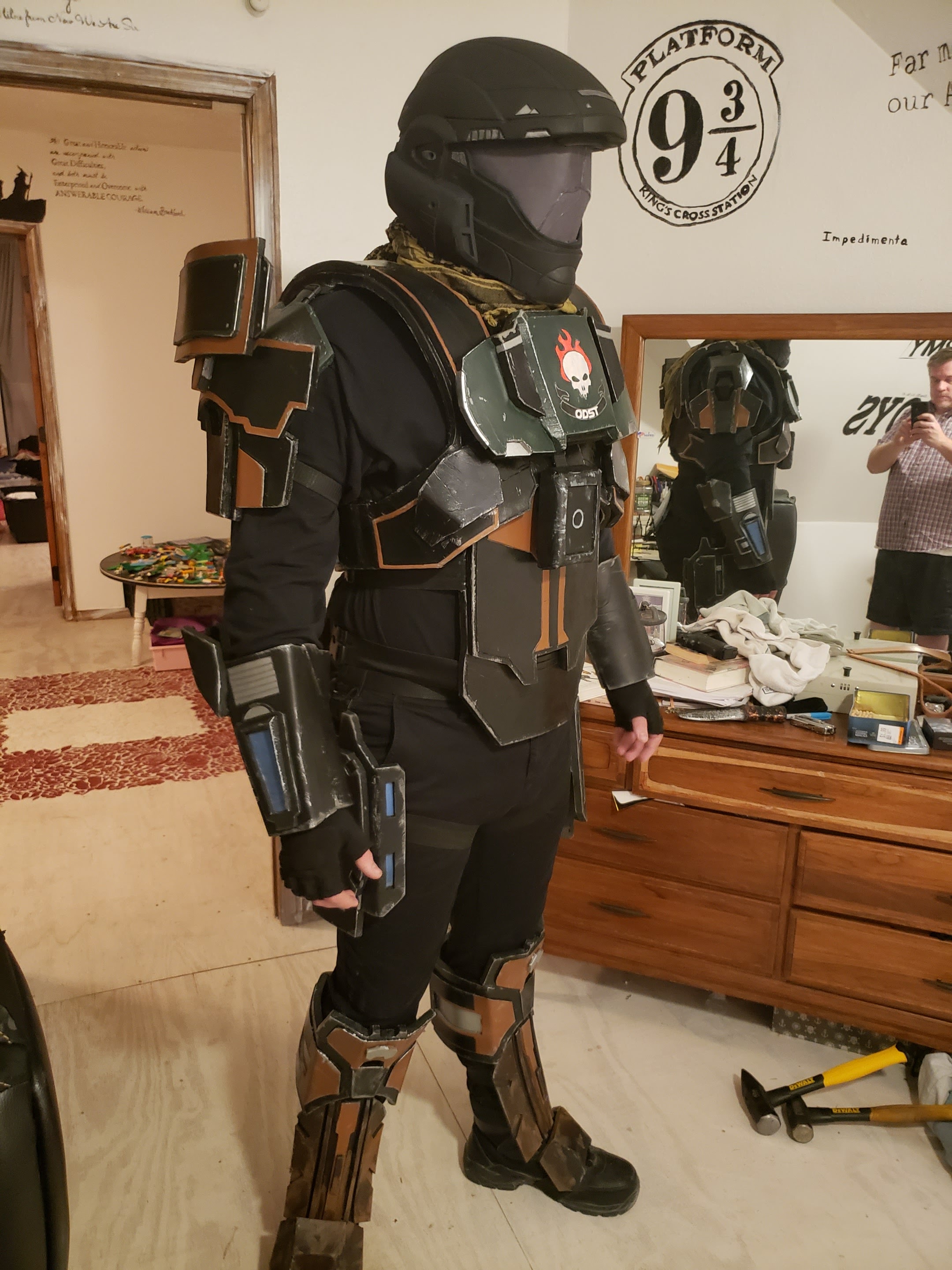 Well, my helmet has arrived! Anyone looking for a good eva foam odst helmet, get it from PrecisionProps3 on Etsy. This thing is a gem! I gave it a layer of black spray paint, and also put a paper visor in for that process. Just getting a real visor now, but here is the pictures. In the mirrior, that is my dad taking the pictures.