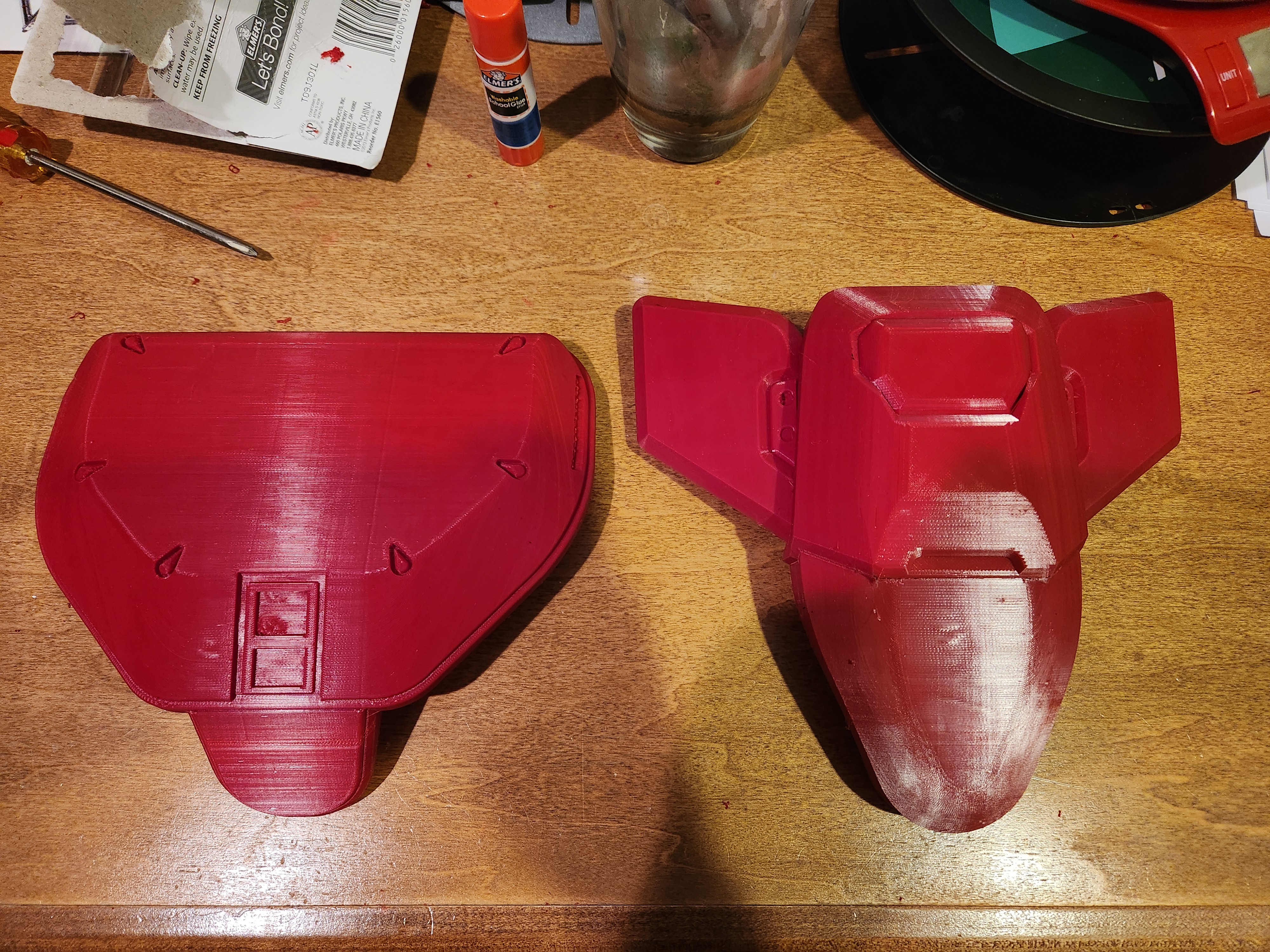 Those are some fine tactical knee grabbers you've got there. All red filament, nice. I'm currently printing a prop in all orange, It's Nerf or nothing.All of the base chest armor and both the knees are printed now!