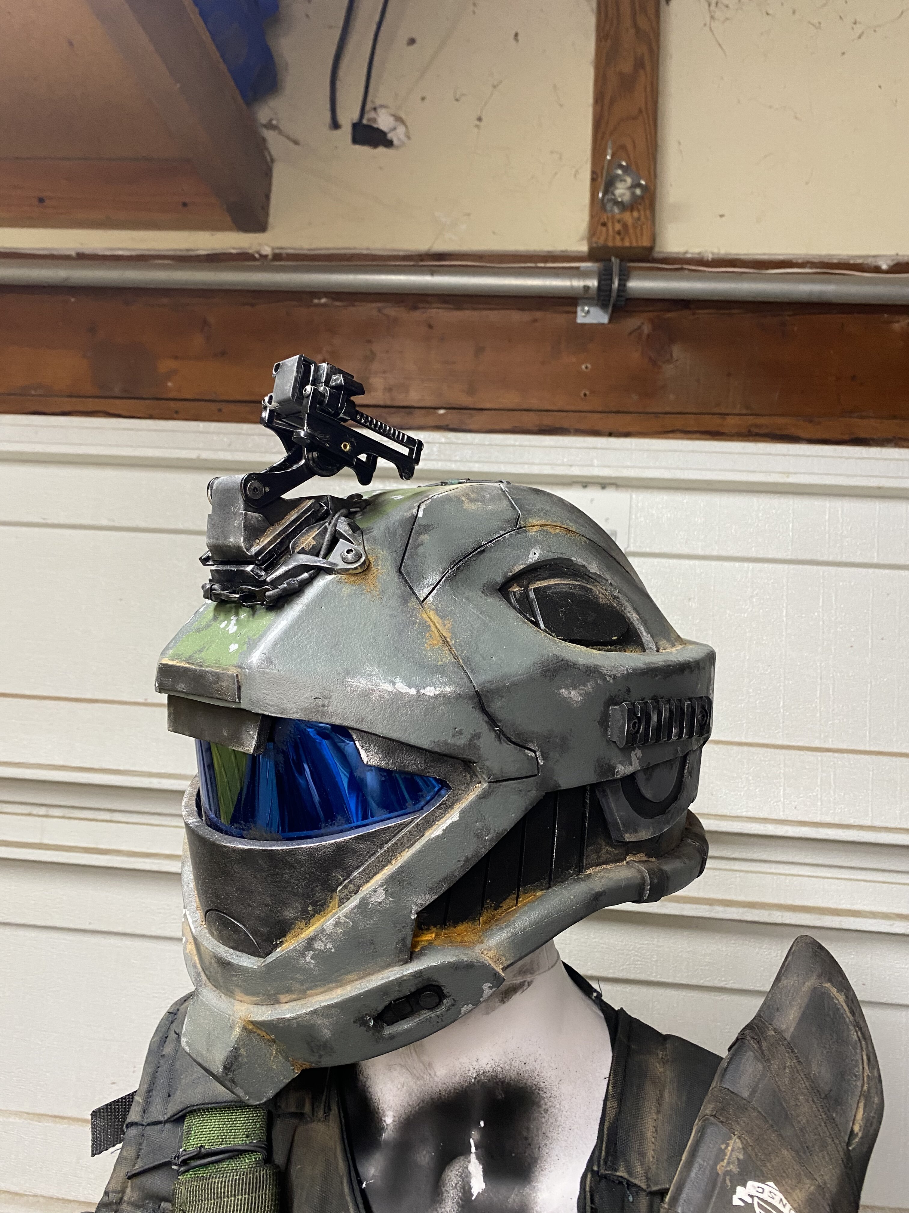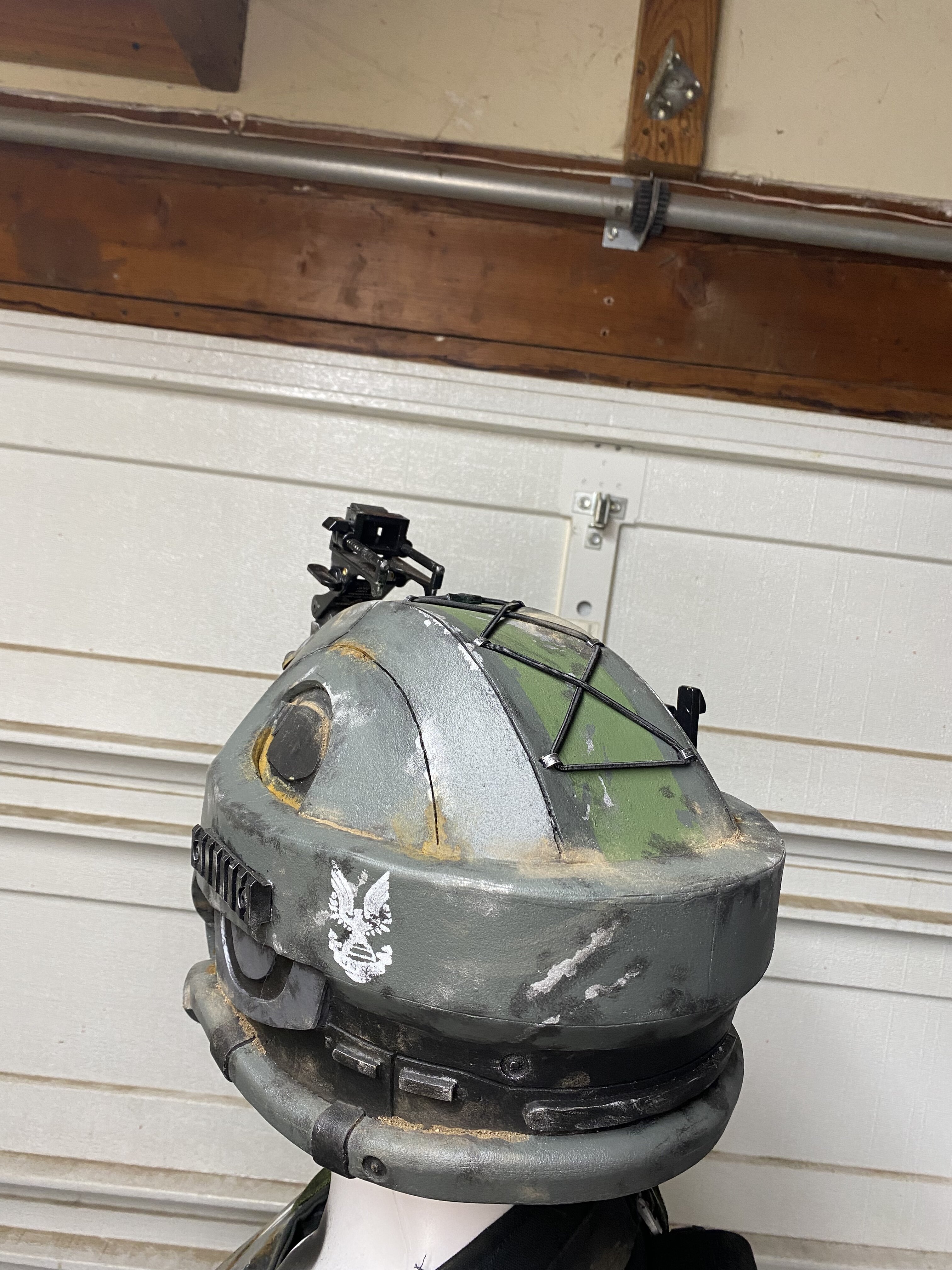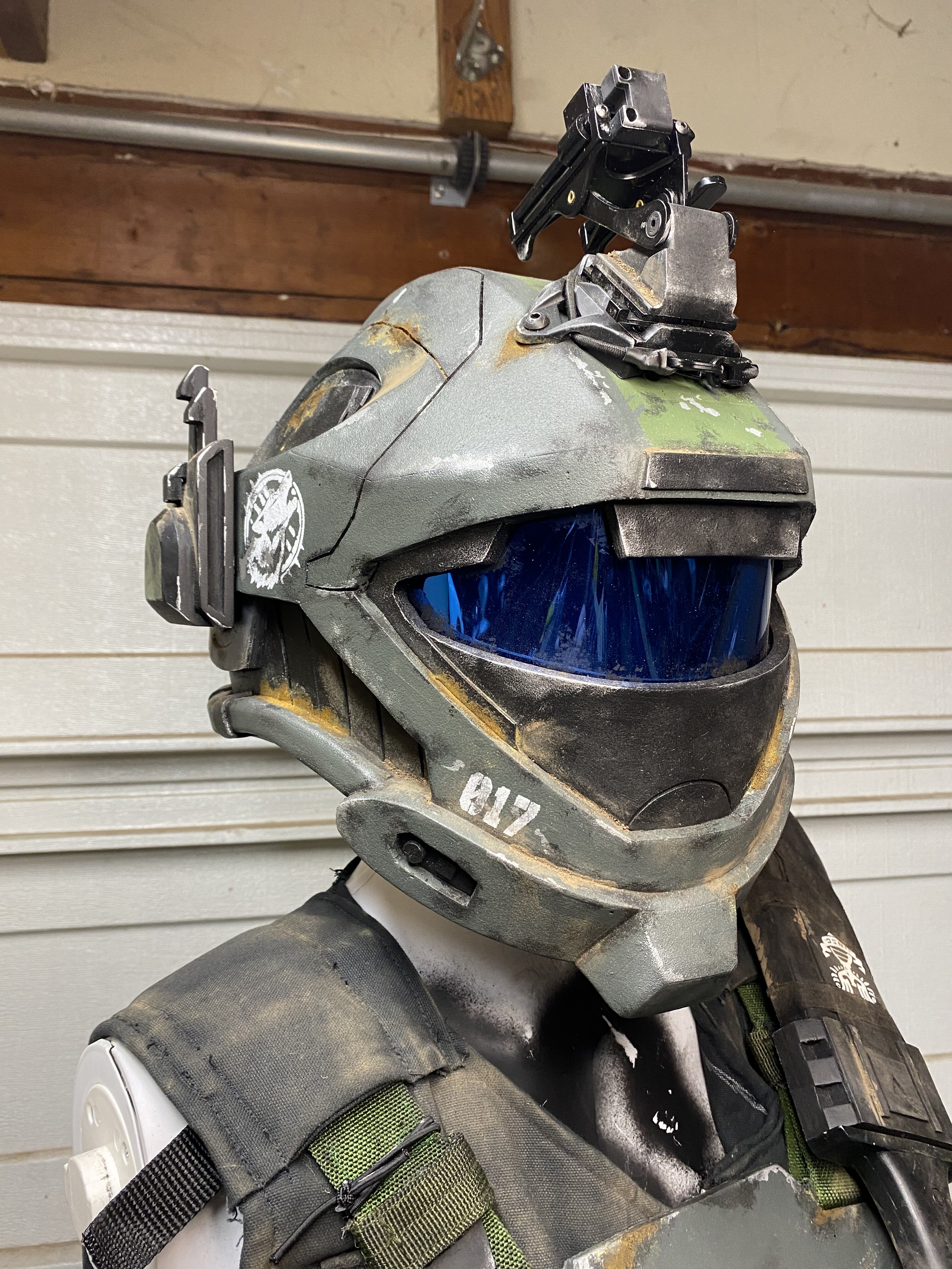 Rakshasa core/ Artaius themed Halo 3 recon helmet. Eva foam build with sintra antenna attachment and tactical attachments from AliExpress. While I really liked the armor set, none of the helmets really spoke to me other than the artais only being the least unsavory than the others since it kind of looks like an ODST. And since this Spartan build is a lore continuation of my ODST cosplay figured he’d level up his helmet too. Also have been rocking recon since Reach mp and almost made this helmet a couple years ago for a variant for my odst and it had an easier visor to deal with so it was nice to finally pull the trigger on this build. Same grey/green as my ODST and decals/numbers in the same placements as Dare’s and forehead attachment worked perfectly since the original design looks to already have a mount of some kind. Weathered with blackwash acrylic, silver rub n buff, rust activator paint and real dirt. Full suit build reveal coming soon!