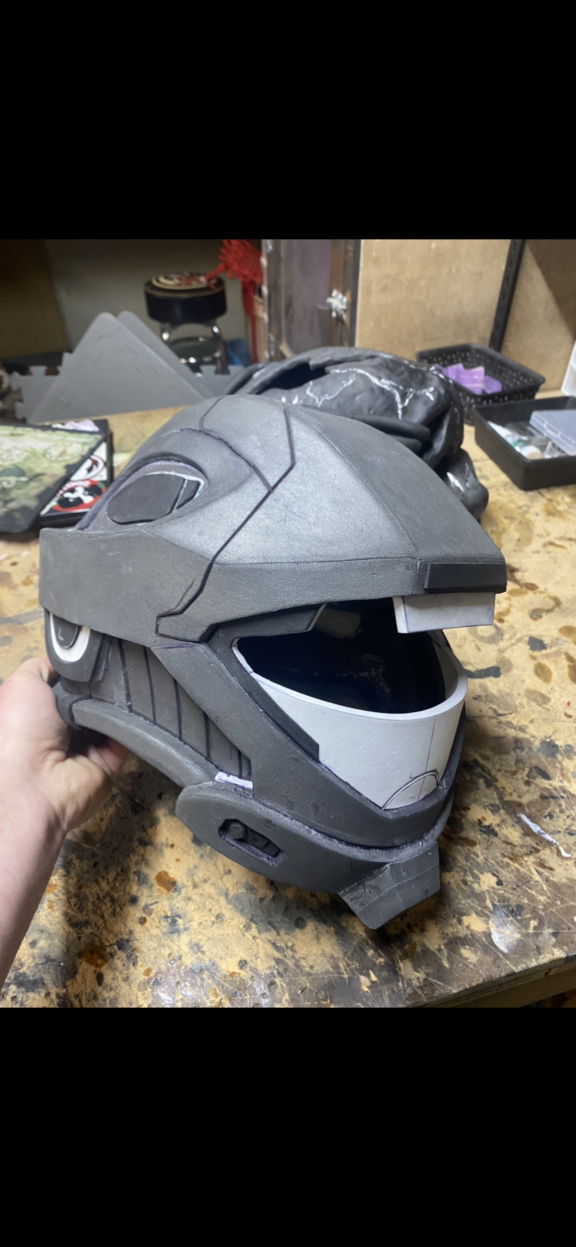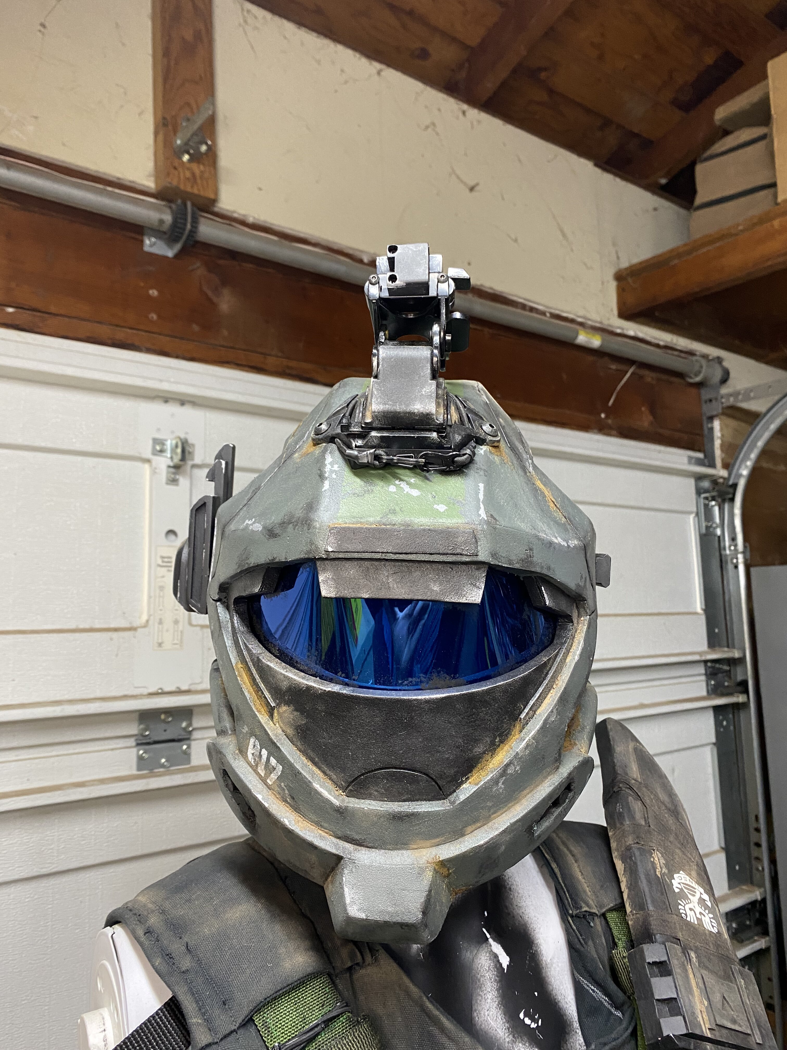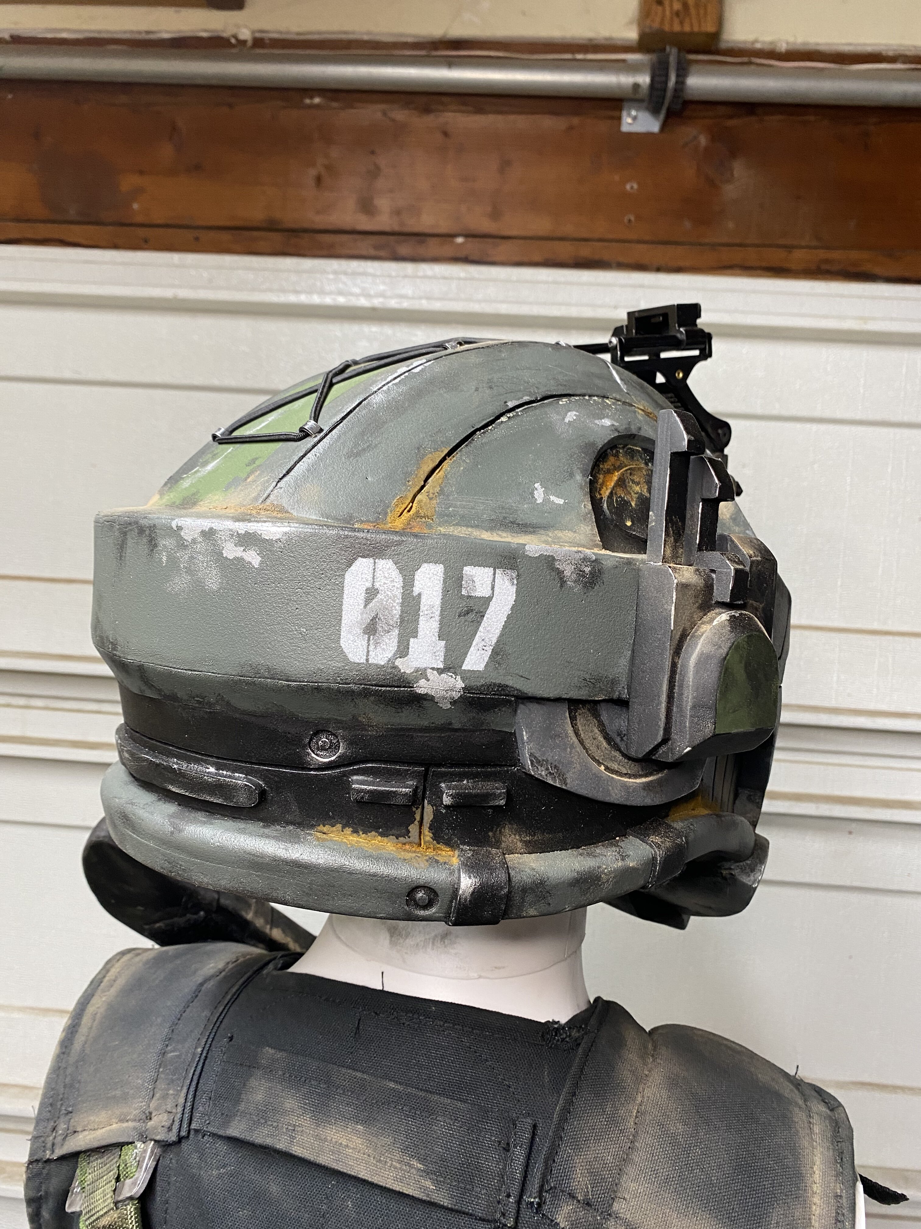 Rakshasa core/ Artaius themed Halo 3 recon helmet. Eva foam build with sintra antenna attachment and tactical attachments from AliExpress. While I really liked the armor set, none of the helmets really spoke to me other than the artais only being the least unsavory than the others since it kind of looks like an ODST. And since this Spartan build is a lore continuation of my ODST cosplay figured he’d level up his helmet too. Also have been rocking recon since Reach mp and almost made this helmet a couple years ago for a variant for my odst and it had an easier visor to deal with so it was nice to finally pull the trigger on this build. Same grey/green as my ODST and decals/numbers in the same placements as Dare’s and forehead attachment worked perfectly since the original design looks to already have a mount of some kind. Weathered with blackwash acrylic, silver rub n buff, rust activator paint and real dirt. Full suit build reveal coming soon!
