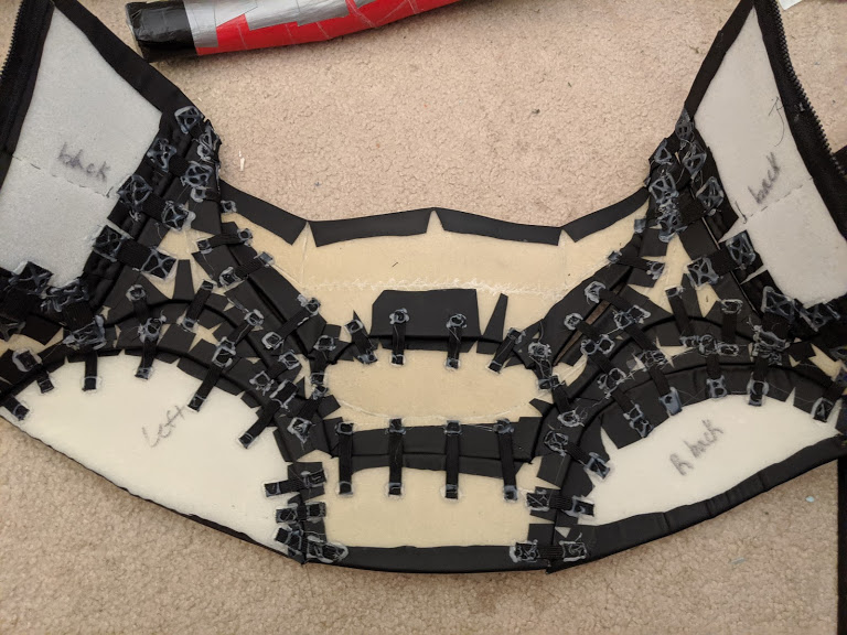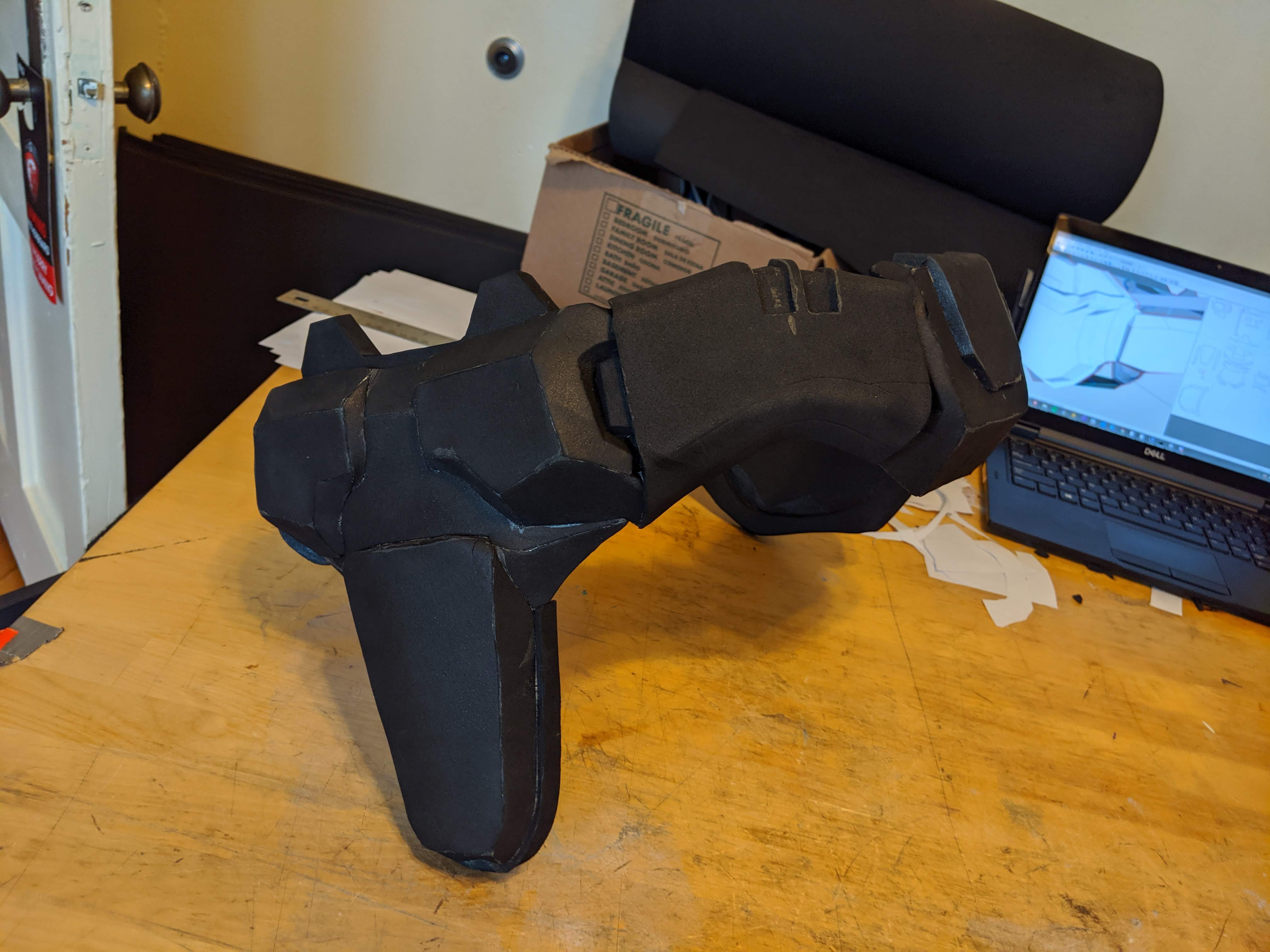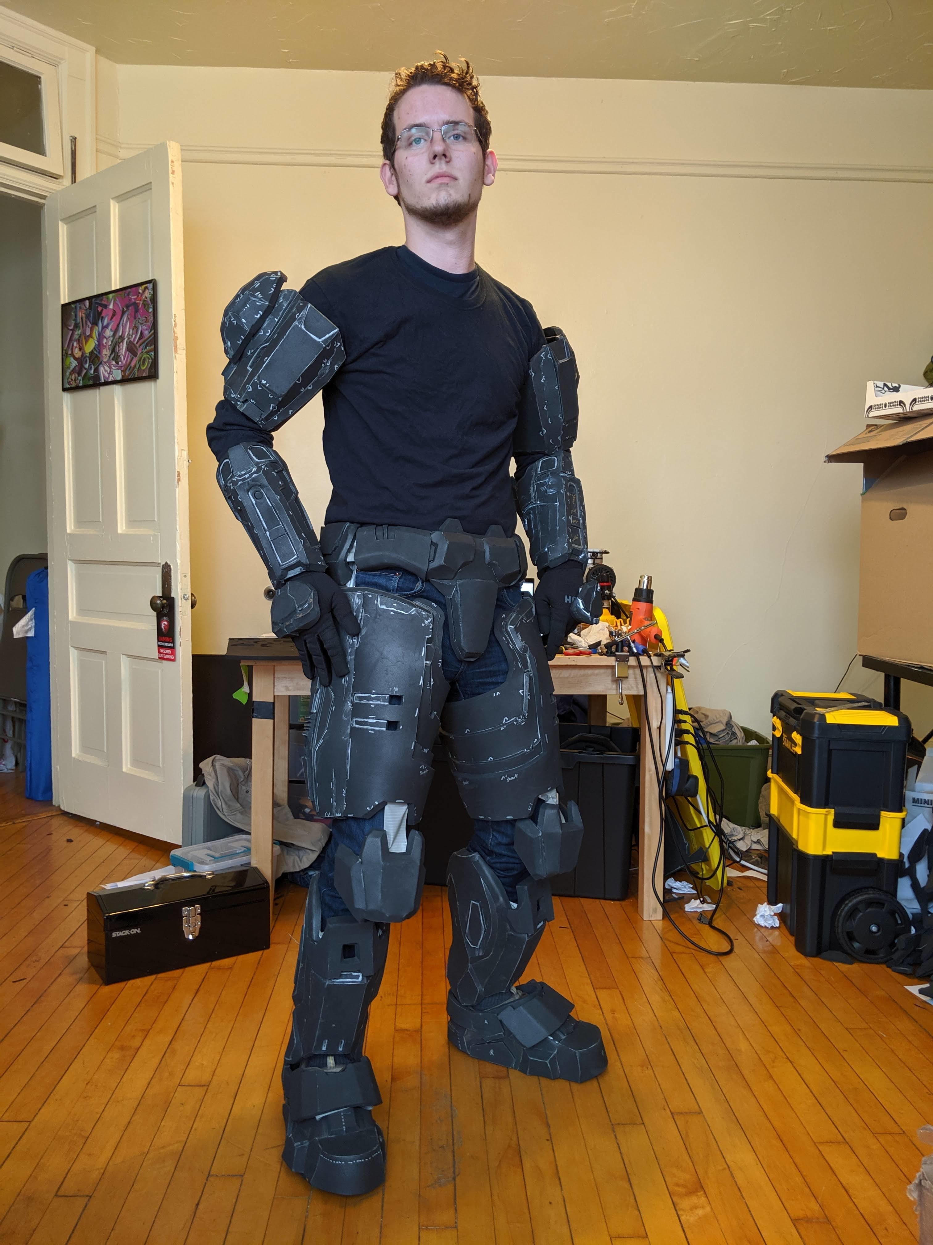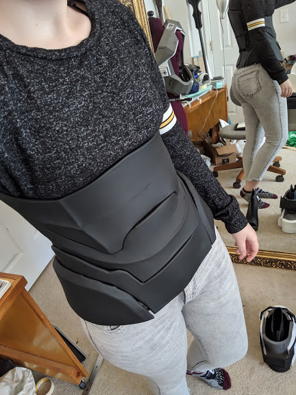Yeah, none of the pieces are sitting properly as nothing is strapped and everything is either held up with duct tape or friction. I'm hoping that once I have things strapped up, thing's will sit more properly. I guess we'll find out when I cross that bridge. It's also possible I may need to scale up the cod piece again, but I think I'll wait until after building the chest to see how everything scales together. The thighs look pinched, either because they're pinched, or because of the weird way I have to stand to keep them up. Time will tellLooks great but it also looks like it's sitting very high on your waist. The cod is to cover your groin area...... and it looks like it's coming up a bit short. Are the thighs in the proper place? They seem to be pinching inward as well, probably preventing the cod from sitting properly.