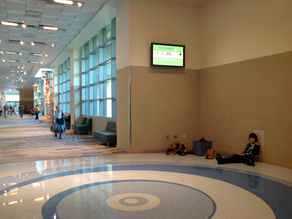 This was our corner for the Con. Me, CheshFire, and CrimsonValkyrie met up here so I could suit up inside away from the AZ heat and also sit and eat our lunches. (we caught a lucky break. The weather cooled down to 85-ish this weekend so I could leave my armor in the car when not wearing it). The girl sitting there next to my tub full of armor is my dear friend Sam cosplaying Roy Mustang from FMA.