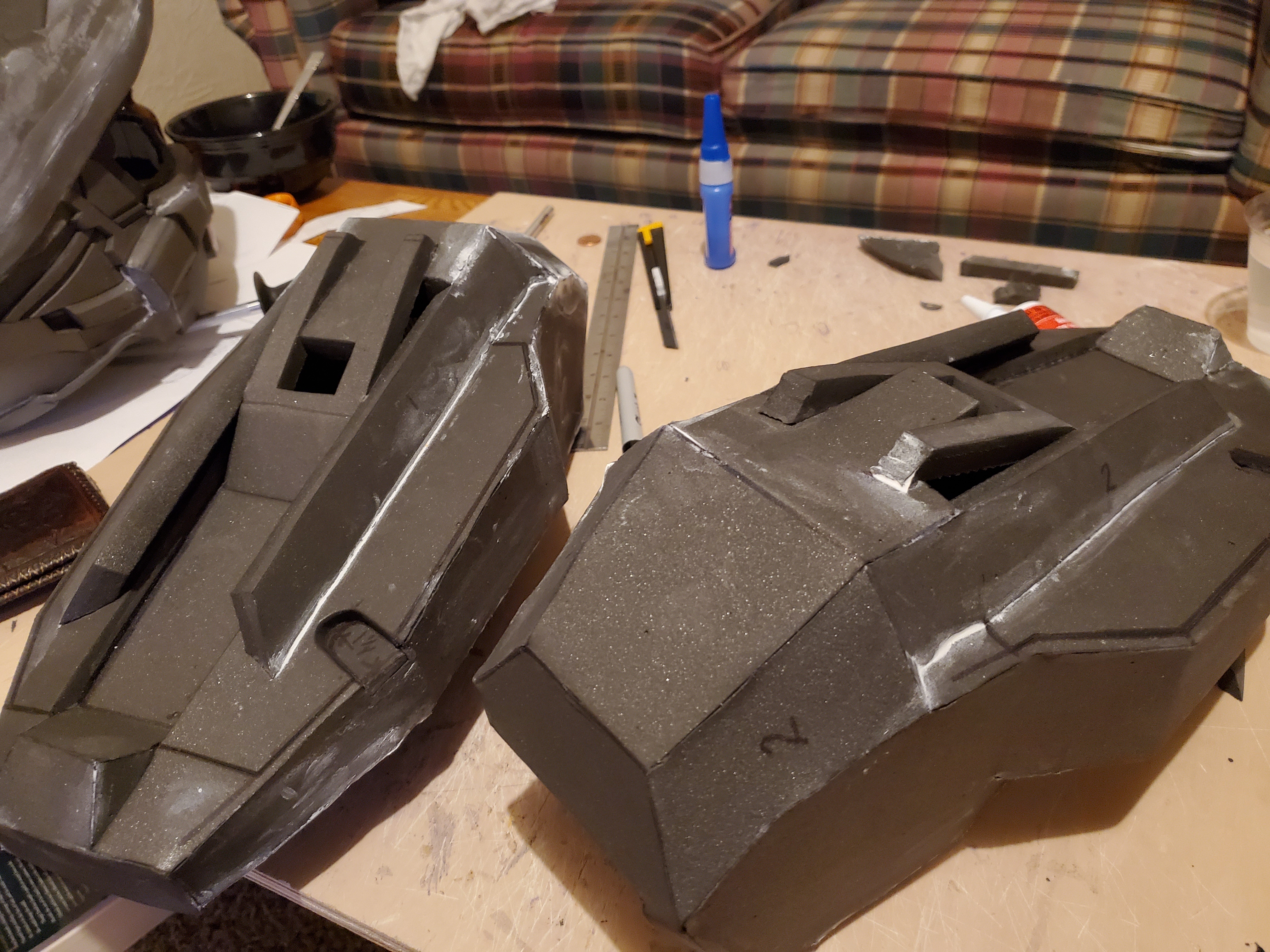 Need to sand them down in places, but I'm much, Much happier with the look and the detail I have in these ones. Those vanes down the center are straight, (I didn't accidentally switch the side panels...) the step down part in the middle is level, and, with only a few exceptions, the seams look really decent. Ish.