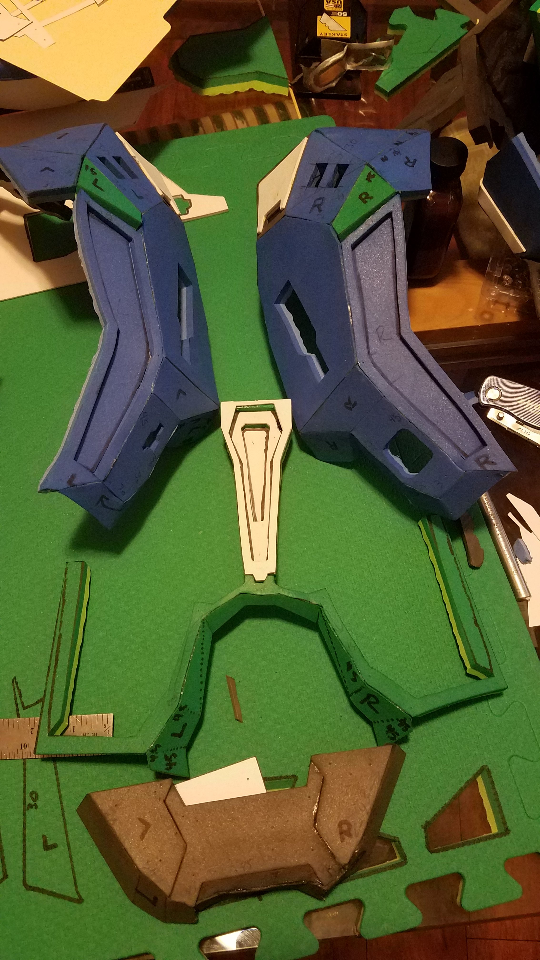 Working on the back center of the chest piece. Ran out of contact cement, so had to use hot glue.I don't like working with that stuff, but whatever.