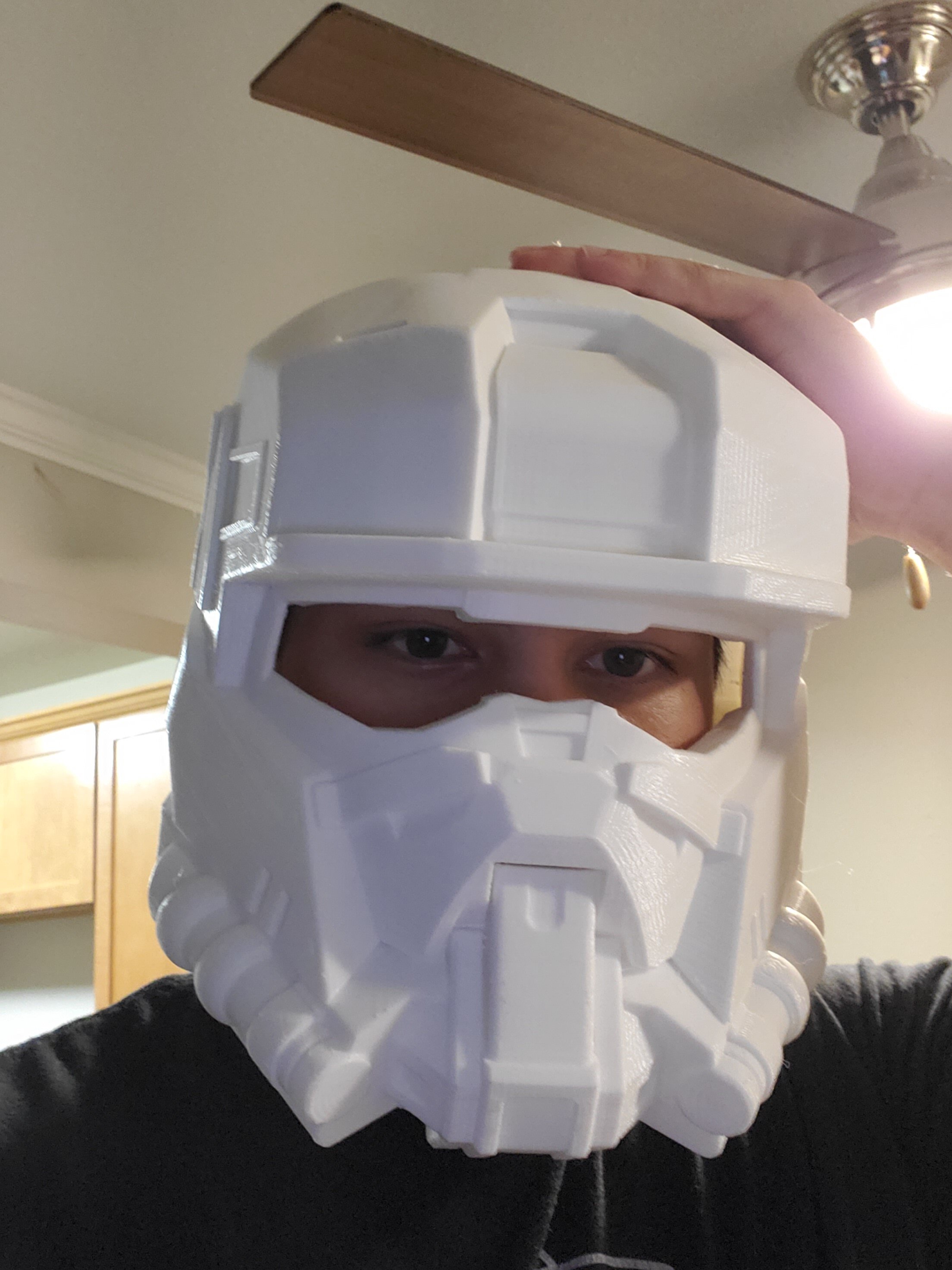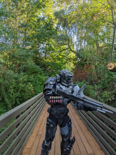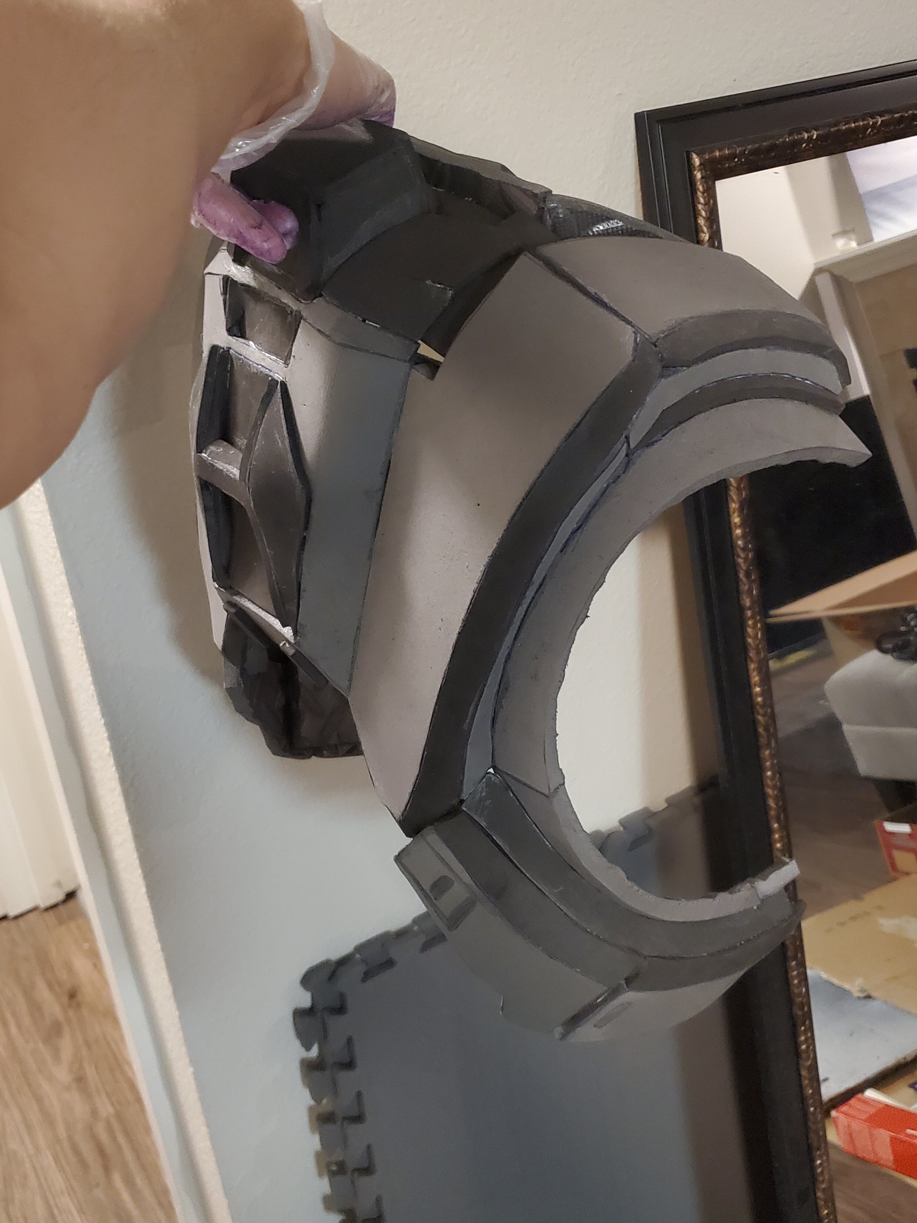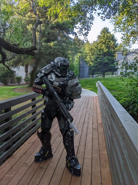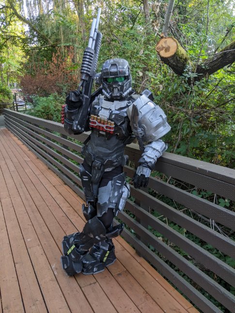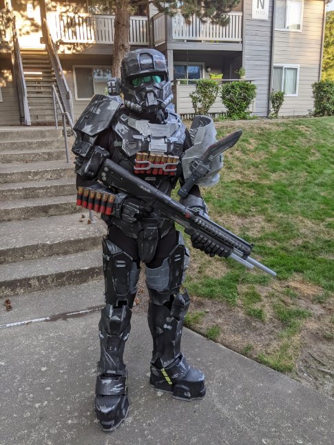 Walking around is quite easy and comfortable. Some pieces tend to shift around so some extra padding in the shins and forearms. I added a little bit too much padding to biceps. Only thing that ripped was right bicep, fortunately it ripped at a seam so I will reinforce that with cc. I also plan on taking out some of the inner bicep so that it gives me some room under my arm. Despite the comically large shoulders, I can still put on and take off my helmet with ease. Helmet fan makes a HUGE difference when it comes to helmet fogging up. Will post another update showcasing my complete 100% build before the con. Until then!