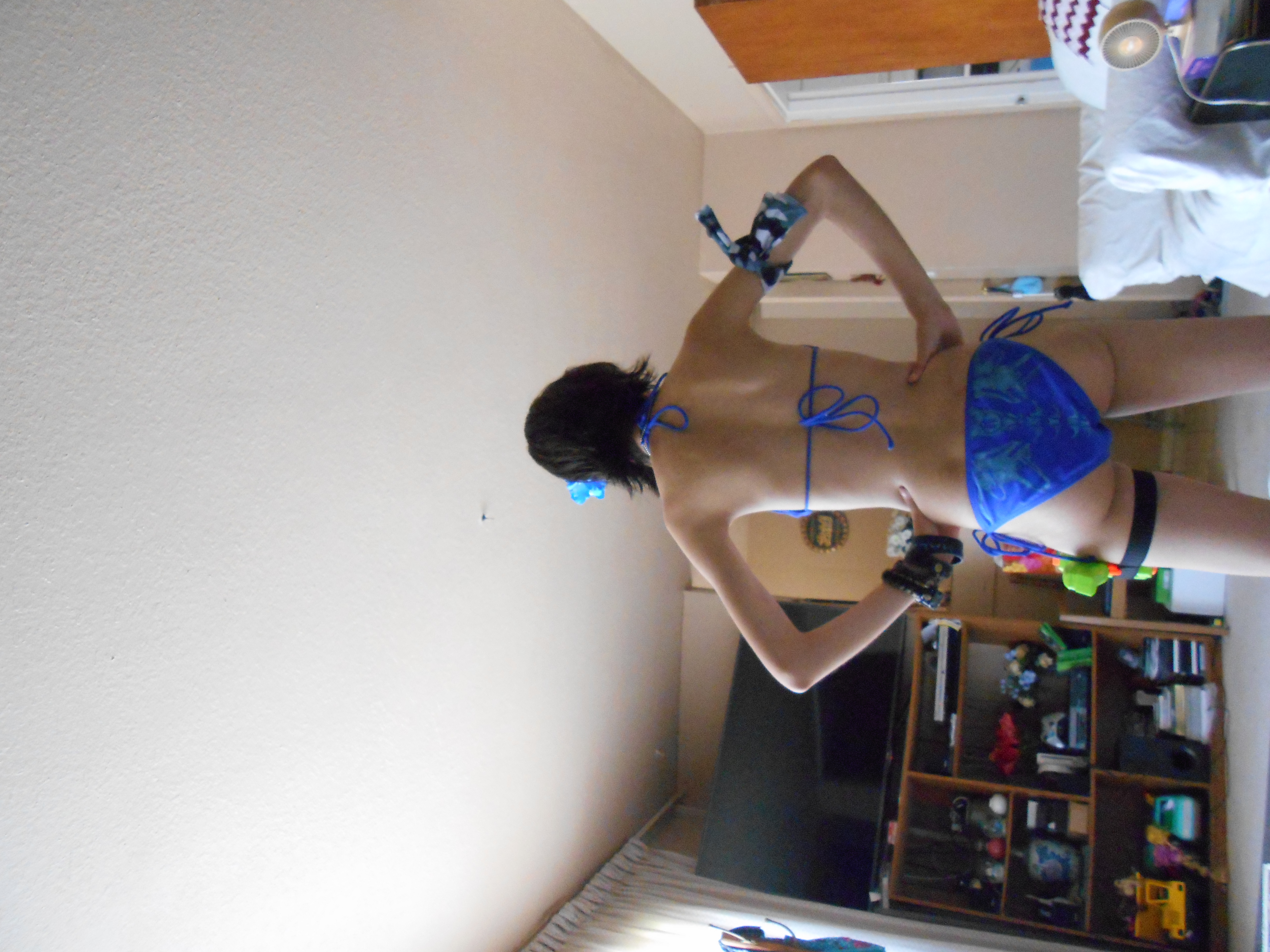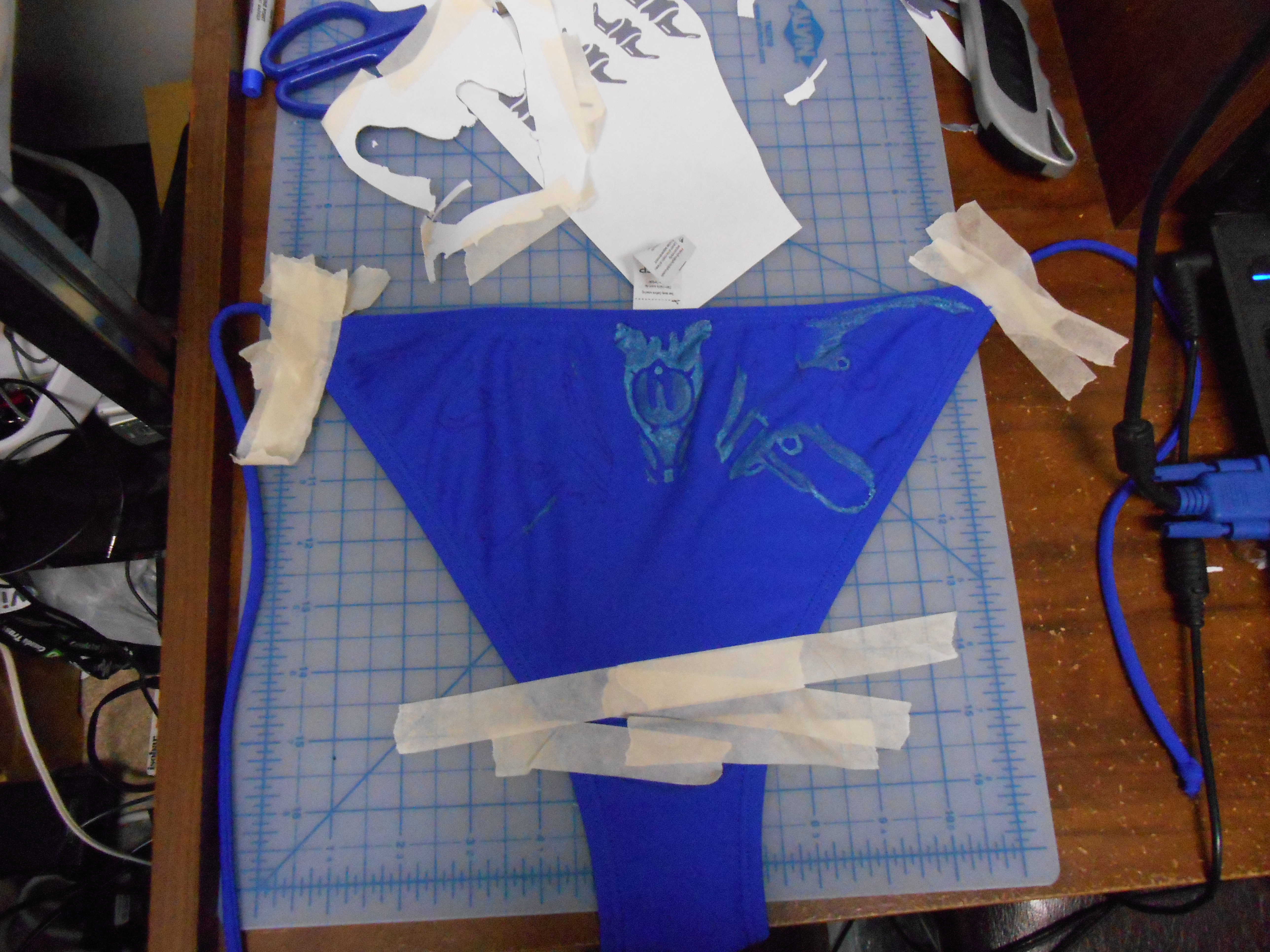Small update, I was able to purchase most of the necessary items for this project and am now just working on the patterns for the top and bottoms as well as playing with the accessorization a bit. I bought a nice brown coverup with an open front as well as a camo blue piece thingamy to tie around my arm and a water pistol. The good news is that the paint should be waterproof and is just in need of a treatment to set it into the fabric and bond it to the fibres.