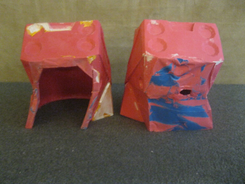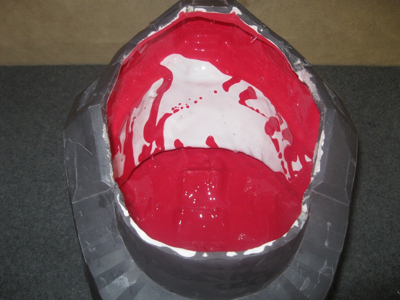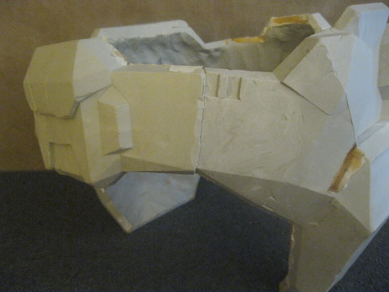 So, I began building my parts with the tabs on the outside. I did this because I didn’t want to bother with filling in all the recessed areas left from the tabs. This was kind of difficult at first (breaking the traditional building habit was the hardest part), but eventually I got the hang of it. I managed to build each part in Pepakura except for the helmet. When I got to the point where I felt I could move to the next step I began hardening my parts. This took place at the beginning of October in 2012. I made the mistake of using Smooth-Cast 65D as my hardening material. The strength required for this method was so much more than you would normally need for traditional glassing. This is because you are sloshing plastic on the inside. When you add the weight of the plastic with the fact that you are rotating the part you leave yourself open to a lot of warping. Because I made this mistake, most of the parts I made at this point were leaving me feeling unhappy. My boots were the right size, but they were warped too much for me to want to continue with them. The Cod piece was way too big. The shoulders ended up warping due to the lack of support in some areas. The only parts that moved to the next step were the shins, one forearm, and one thigh. The chest was not strengthened at this time. I had already learned I needed to swap to polyester resin by the time I came around to hardening the chest. I refused to rebuild the chest because I allowed it to warp.