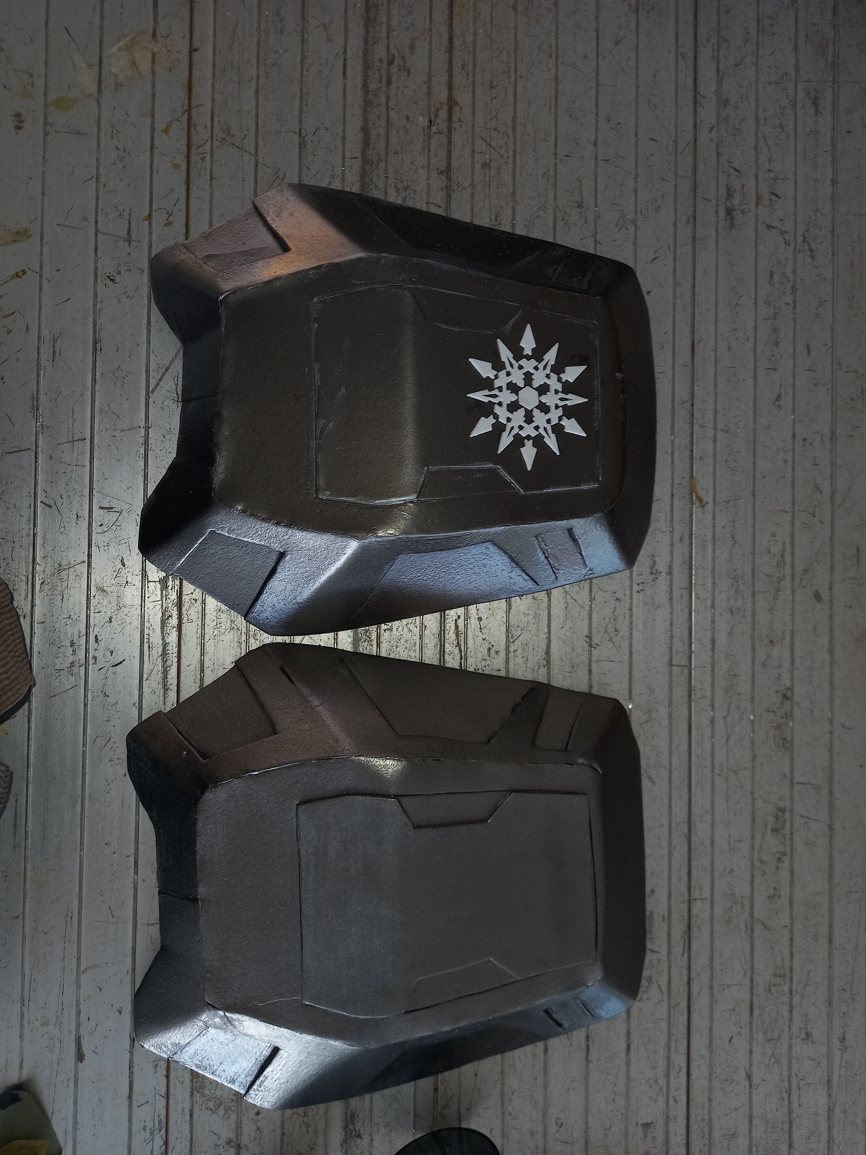 Here are the Shins, as you can see they are not that great when it comes to quality, i started this project way back in late 2018 when i was still a noob when it comes to foamsmithing, I have scrapped and rebuilt many of the armour components including the forearms, thighs, Chestplate, biceps, shoulders boots and the shins. The shins are the only part of the old prototype to still be a part of my current set. I used to use hot glue back then but as all my fellow Aussies will know, hot glue melts in the sun sometimes causing high stress points to come apart.