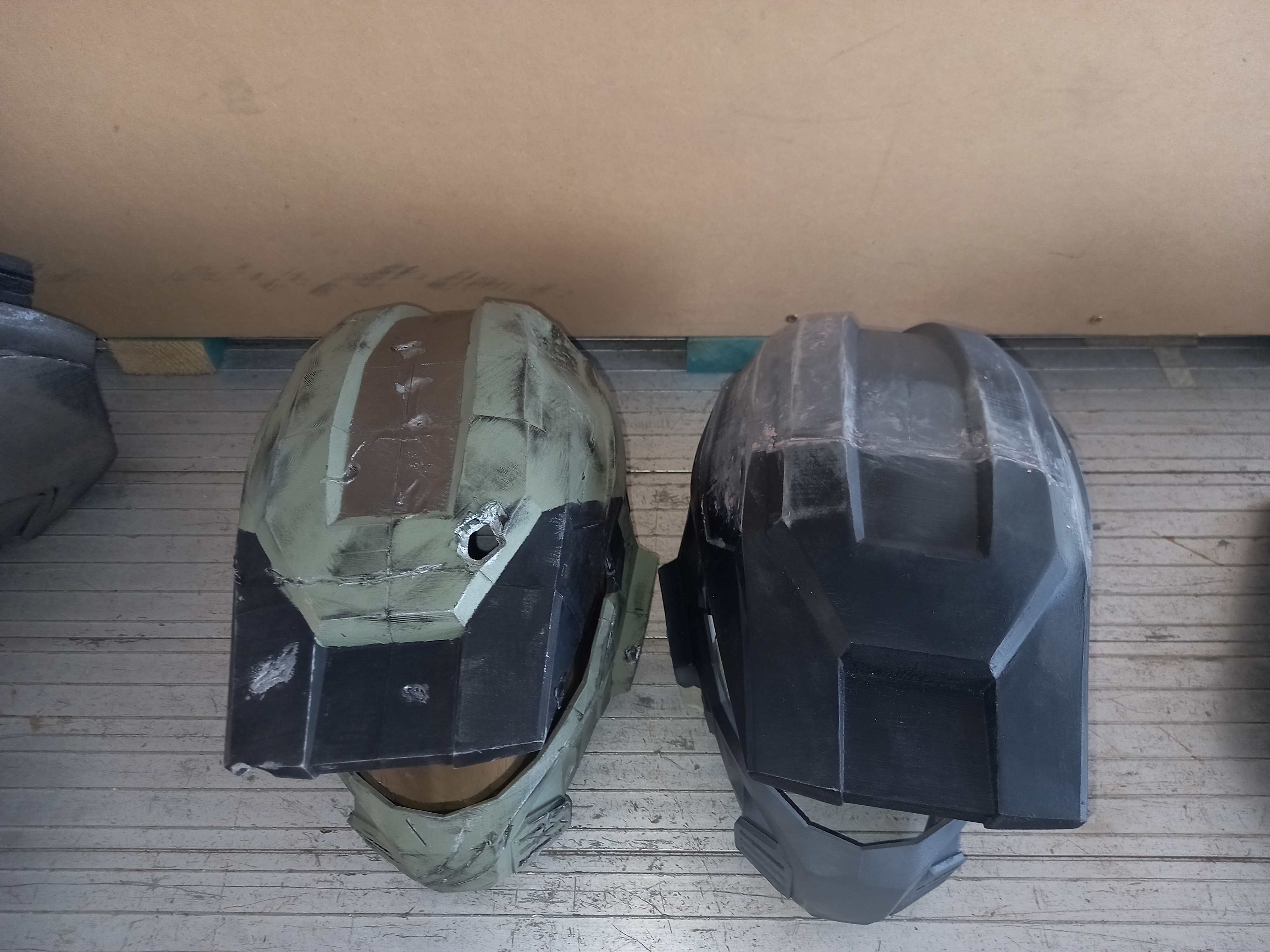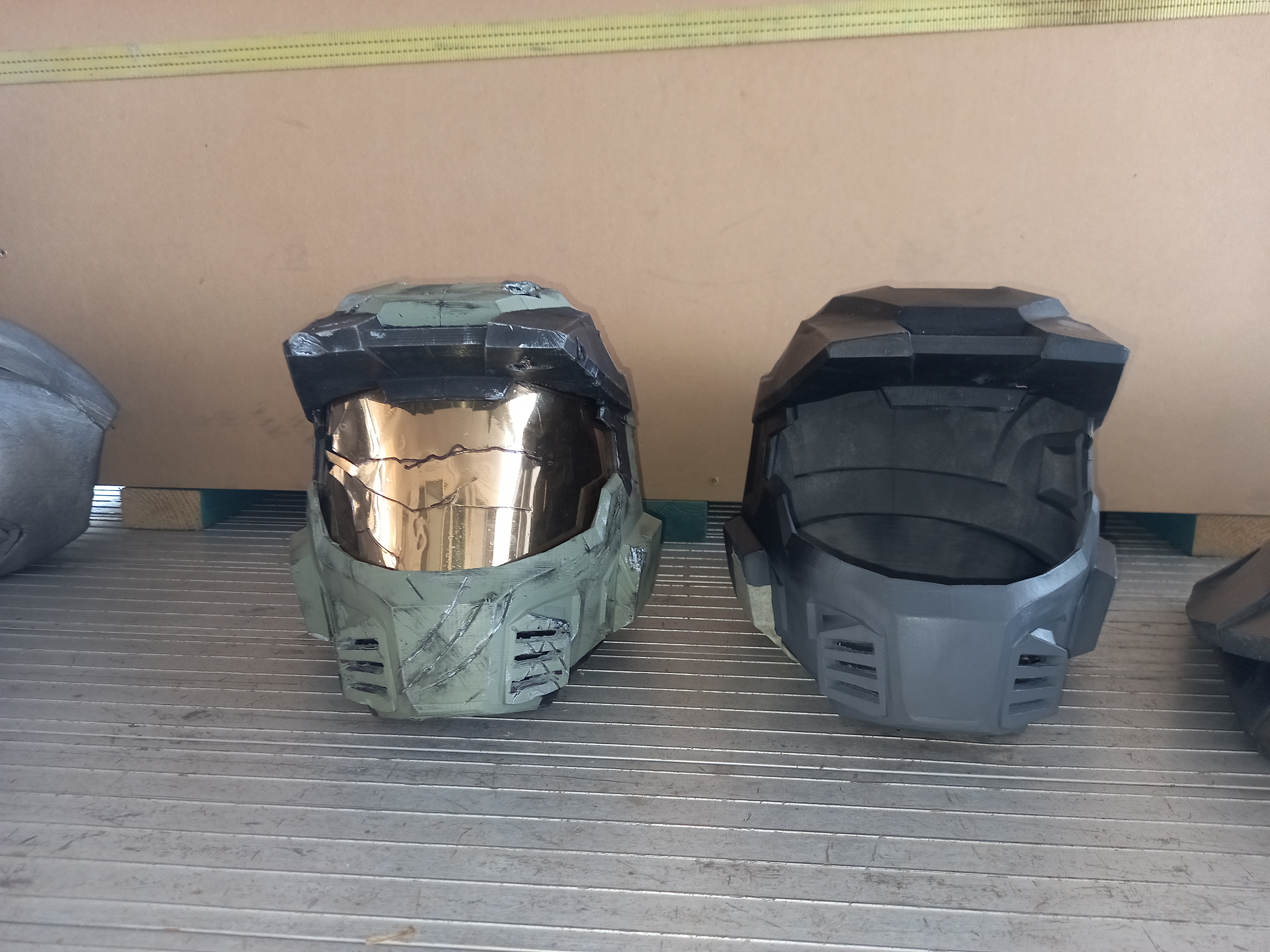 Here are both of the MK V helmets, the green one was a prototype that I made before I understood how to edit 3d files and as such there are a lot of visible seam lines and thats why i made this one my "Battle Damaged" variant. The other helmet is still being worked on but is of much higher quality.