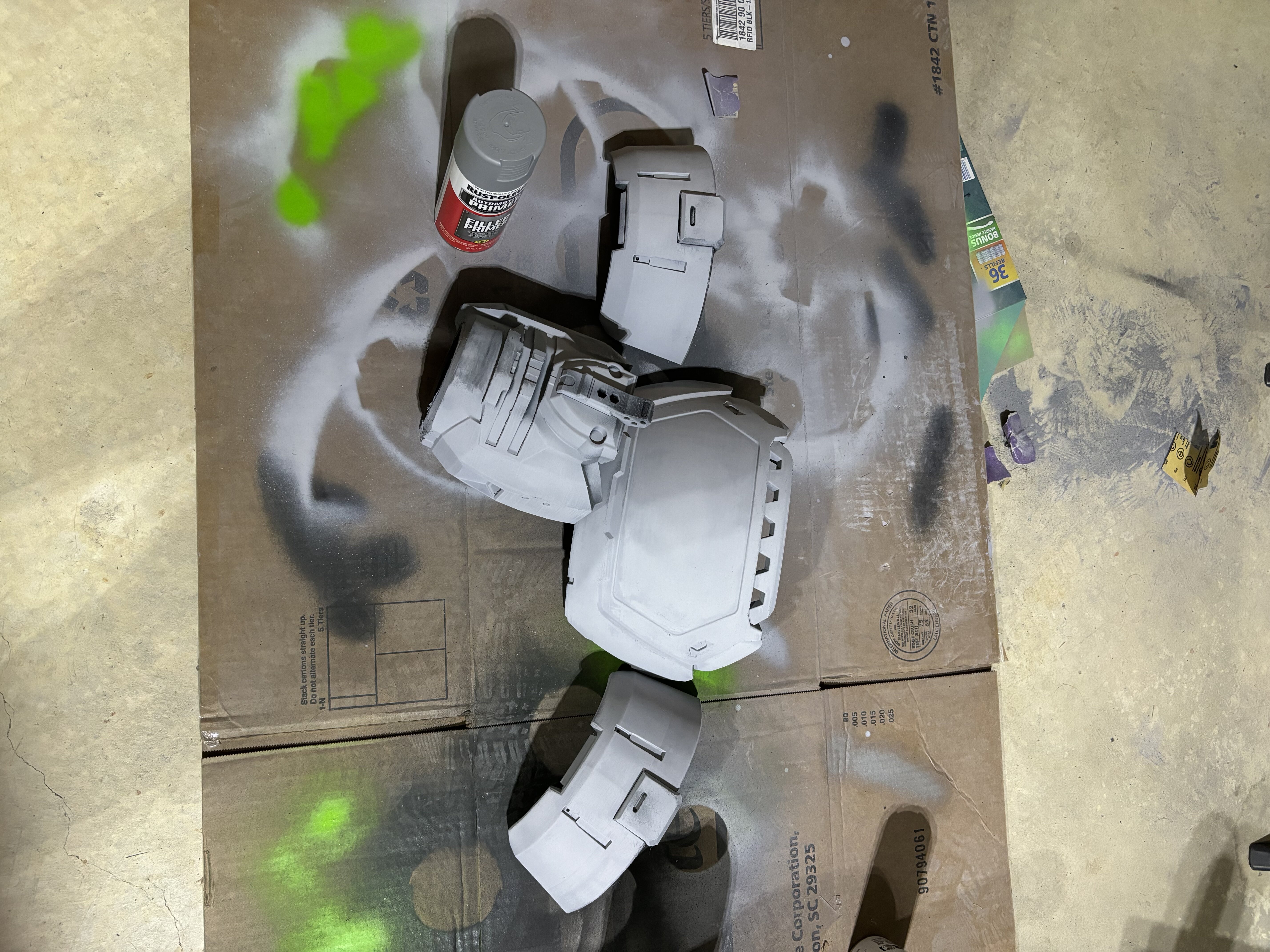 The forearms have received their first coats of paint, with the coating being asymmetrical I’ve started with the green side first. I gotta say, I’m very excited to see the whole thing, this green looks so good!