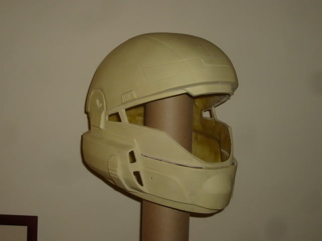 I've been holding off on posting photos of this project for a while because I wanted to get to (more or less) a final stage on it before making a thread. This helmet started off as the lower-resolution ODST pep file (the one with the reduced detailing). During the pepakura stage, I made several modifications to the base model to change it to the Legacy Effects version. The game version and the LE versions have several differences, and the LE version is quite different from the Weta version as well, so special attention had to be given toward the LE detailing. After scrutinizing screen captures from both the "We Are ODST" commercial and the making-of videos, I got to this point with the pepakura model and at that point hit it with fiberglass. Note that the entire jaw portion was redesigned, as well as the temple areas above the visor and the ear portions: