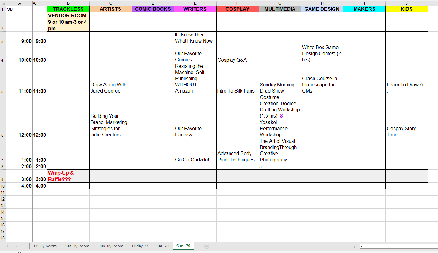 I have attached the con schedule as it stands currently. I would like I think one 405th member as a judge (though if it doesn't work out, we have 3 judges lined up, so we'll fine without it)