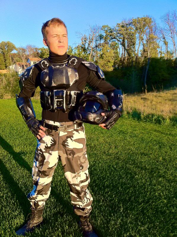 Or more accurately, it's presentable for the launch of Reach. I vacu-formed a second visor, and used Niteshade to give it a nice black tint. Then I finished up my stomach pieces, and put it all together combined it with some army boots and urban cammo pants and Voilà!