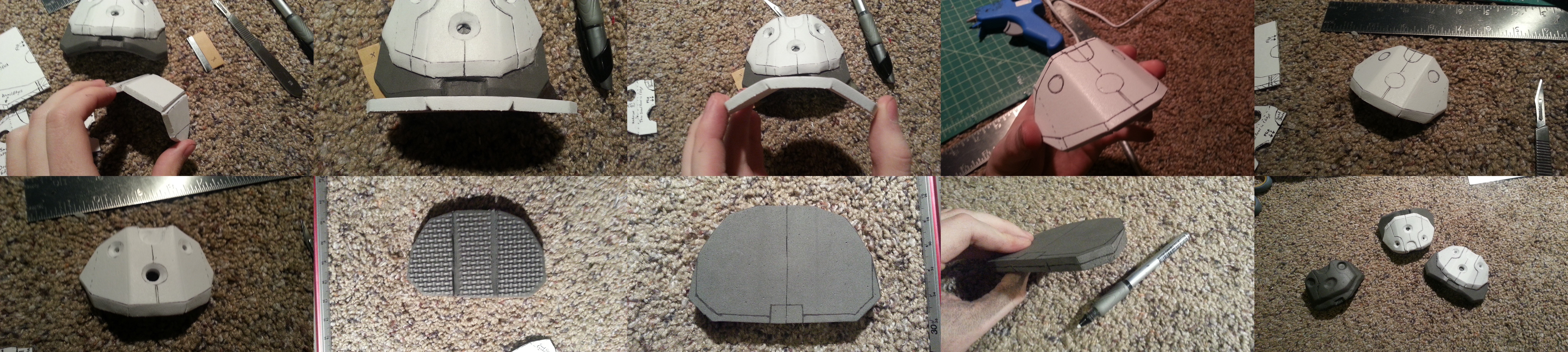 2) From there, with the pieces I wanted to use, I devised/planned on how I wanted to go about shaping these oddly shaped pieces. So what I did, was I made several derived templates for how I was going to Dremel the shapes. The 1/2'' Puzzle Mat foam could have used a top and bottom template, but I had already kinda decided on how far in I wanted to angle the front edge.
