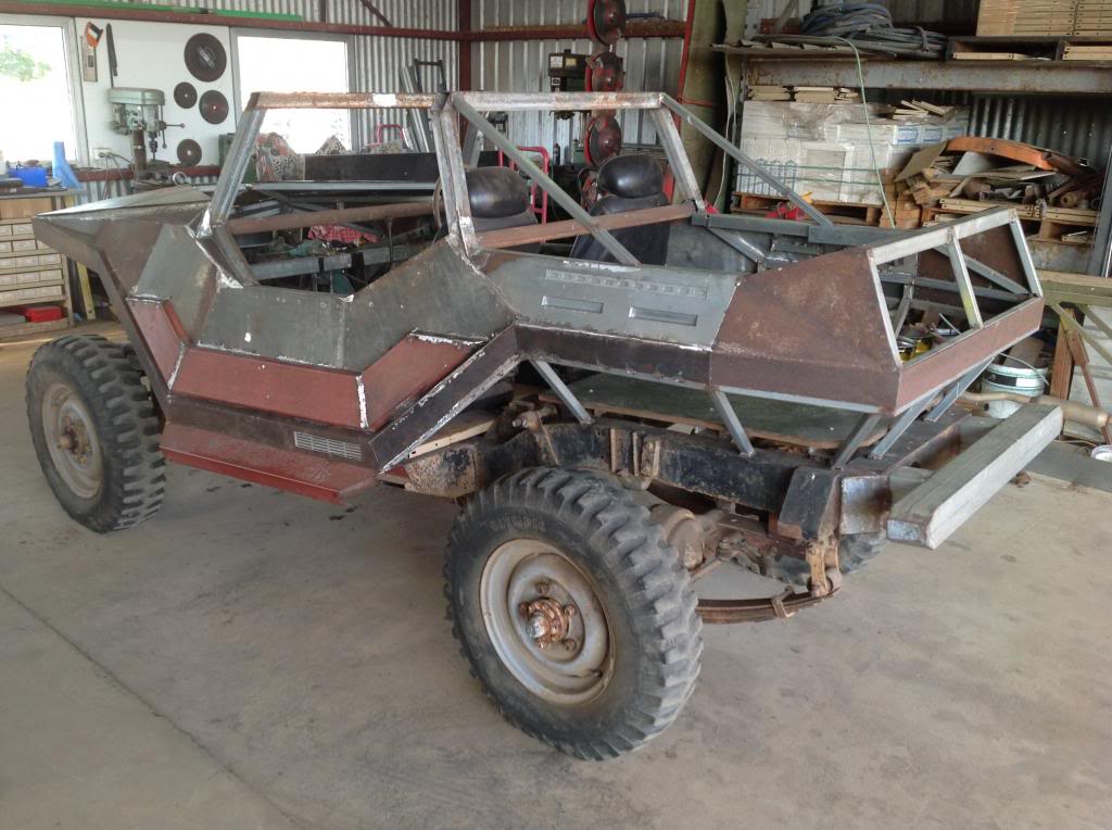 The car I used to build this with is a 1960 Series 2 Land Rover. Like the M12, it has four-wheel steering. This was achieved by removing the back axle, replacing it with the front diff of another vehicle, and connecting it to the steering column via some bodged-up linkage. It cannot, however, crab-crawl. The 4 cylinder engine is still operational and it drives fairly well (apart from the brakes, which I'm currently working on). I started this several years ago, but have only recently started doing some serious work.