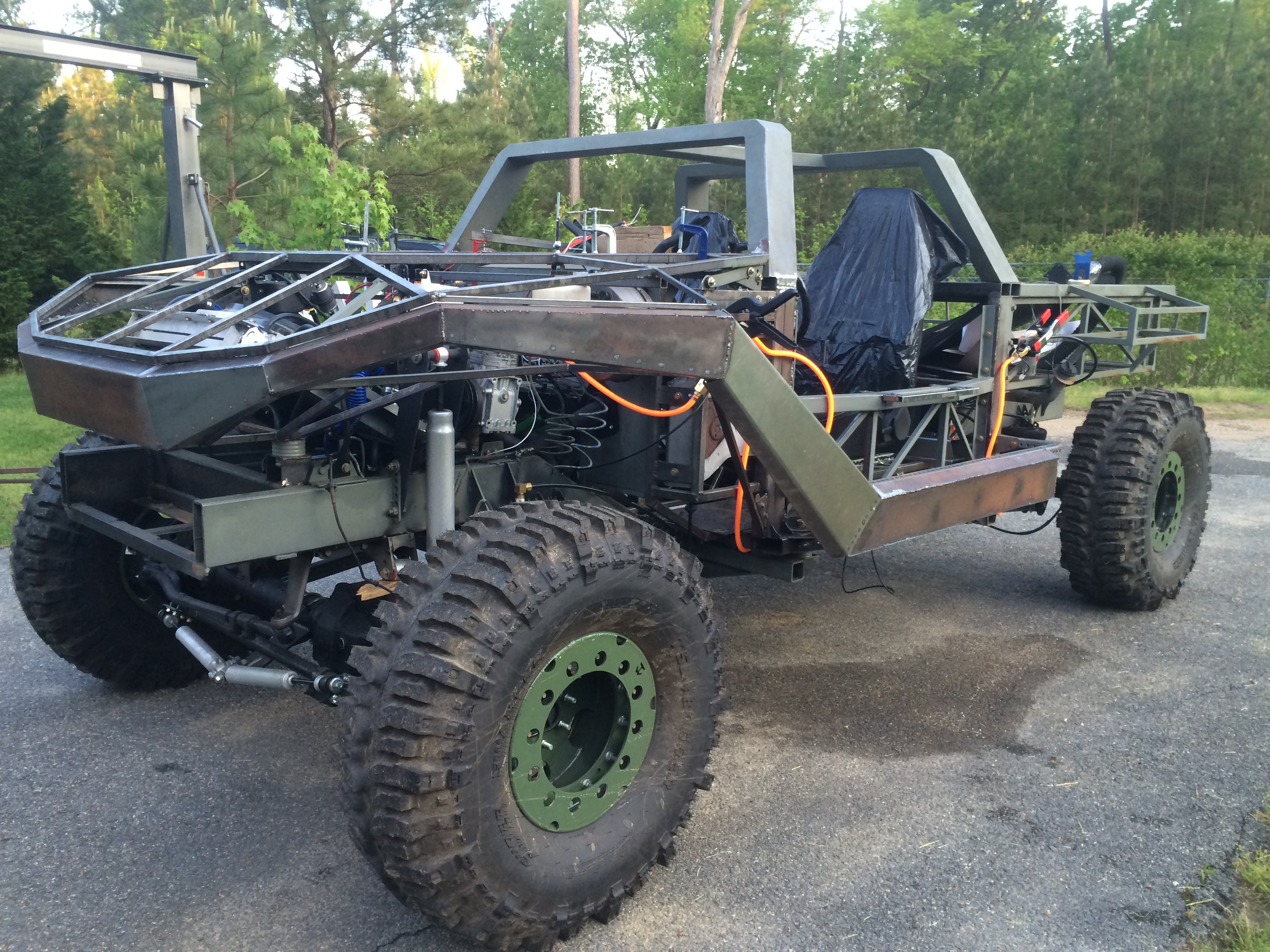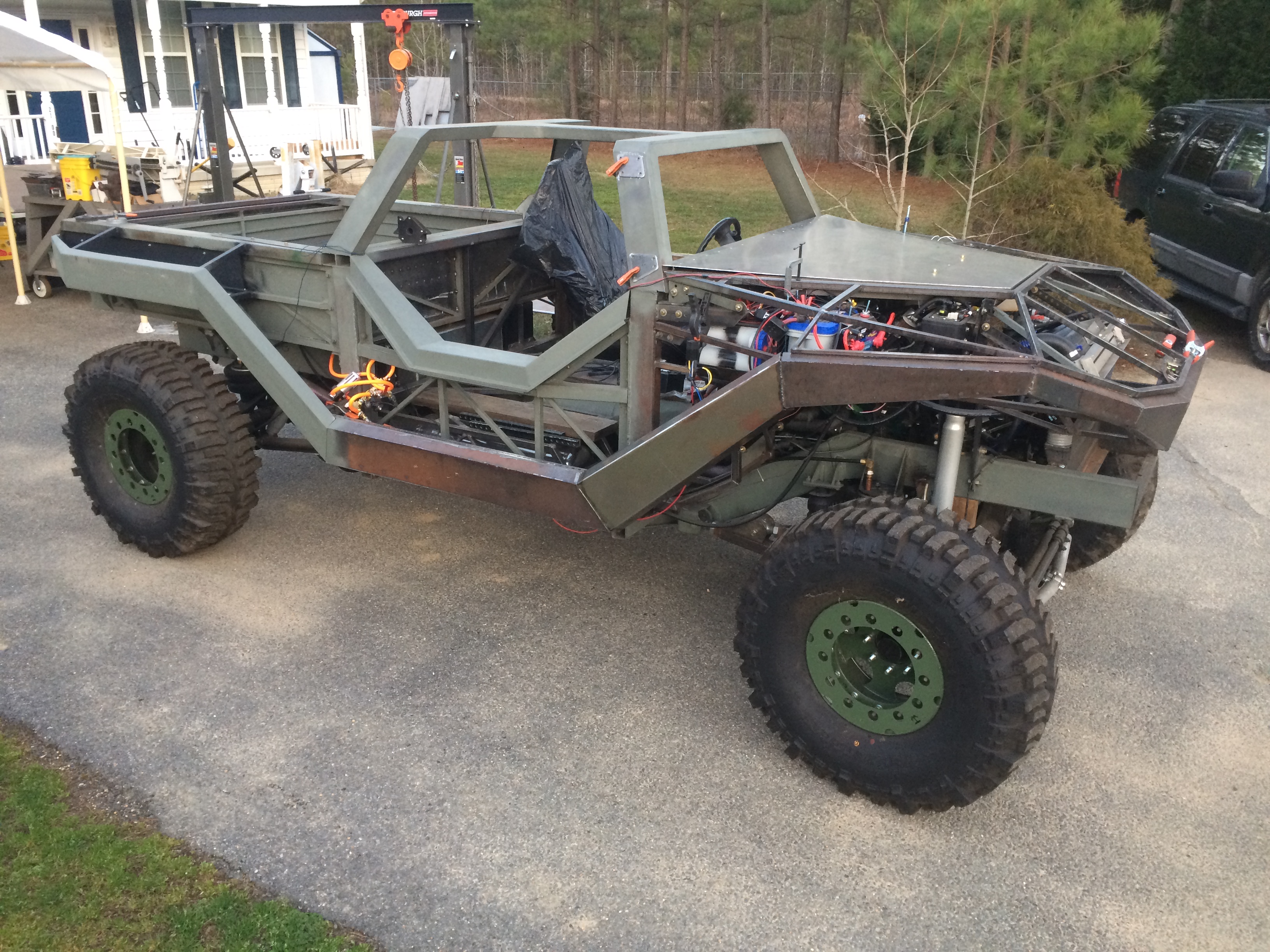 Started with a 1994 Ford F250 truck as the base vehicle, but ended up just using the engine, transmission, and rear axle. It's mostly steel and will likely be heavy when complete. It starts and drives around, although its still just tack-welded in spots. Still no idea how it'll handle at 'high' speeds yet (if it can even get there...)