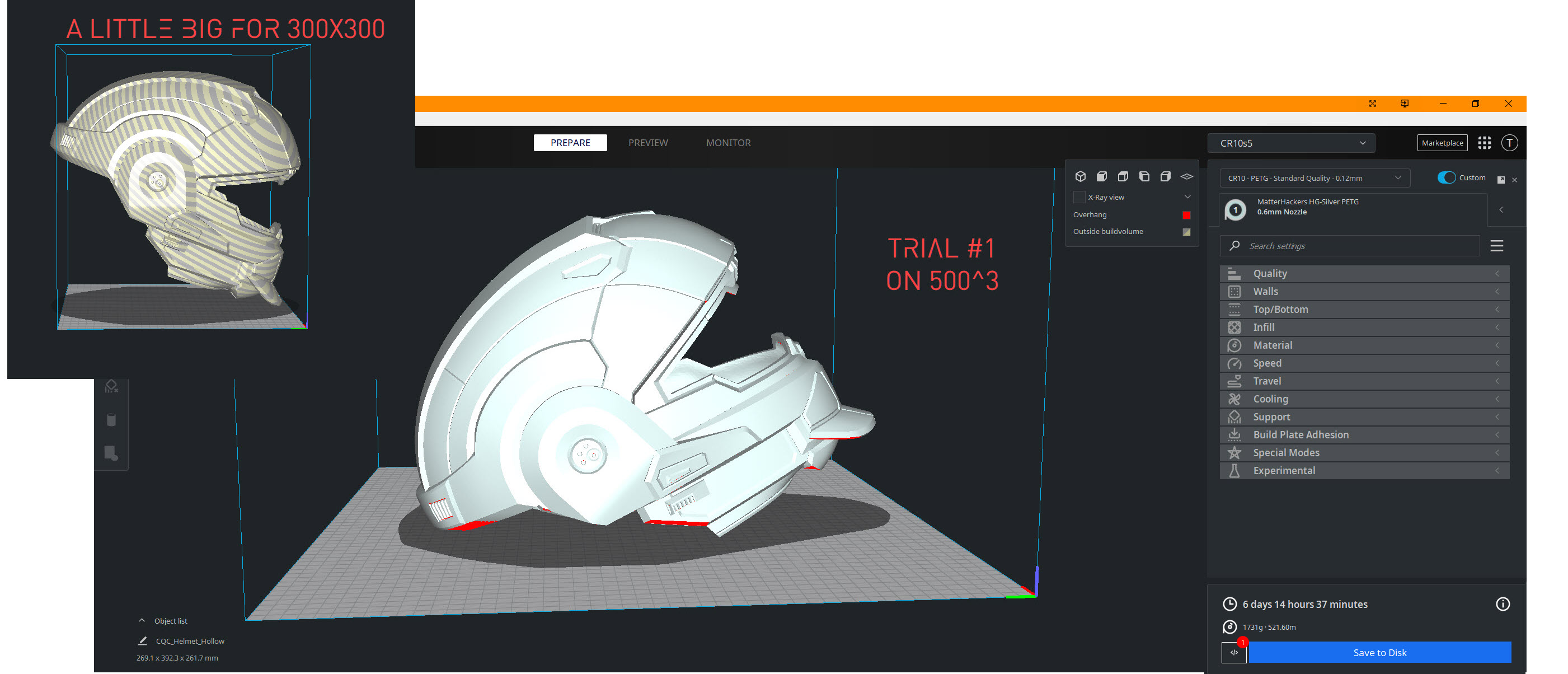 At the 300mm range you still have to break up even a helmet. Frell that! I put a helmet on to print on Monday and take it off the printer on Friday in one piece. No seaming!