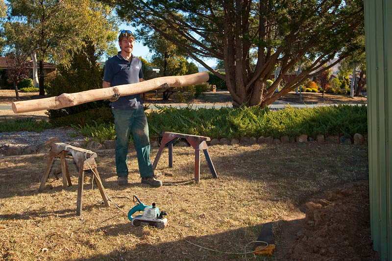 I found a magnificent pine log, well seasoned with the bark just falling off it. It is my intention to cut it four ways down the length, to cut a post out of the middle of it. The post will be kept aside while the rounded slices will sandwich around the centre pier downstairs, making the pier look like a big tree-trunk. This will then be sanded and rubbed with raw linseed oil, as will the stairs and handrails.