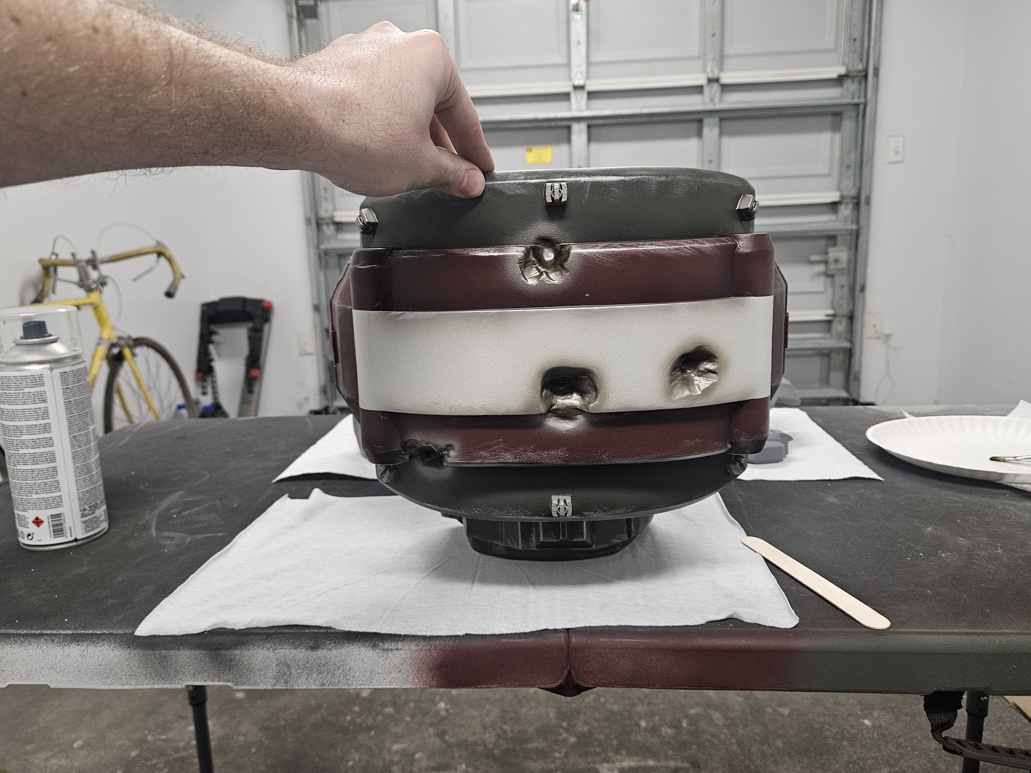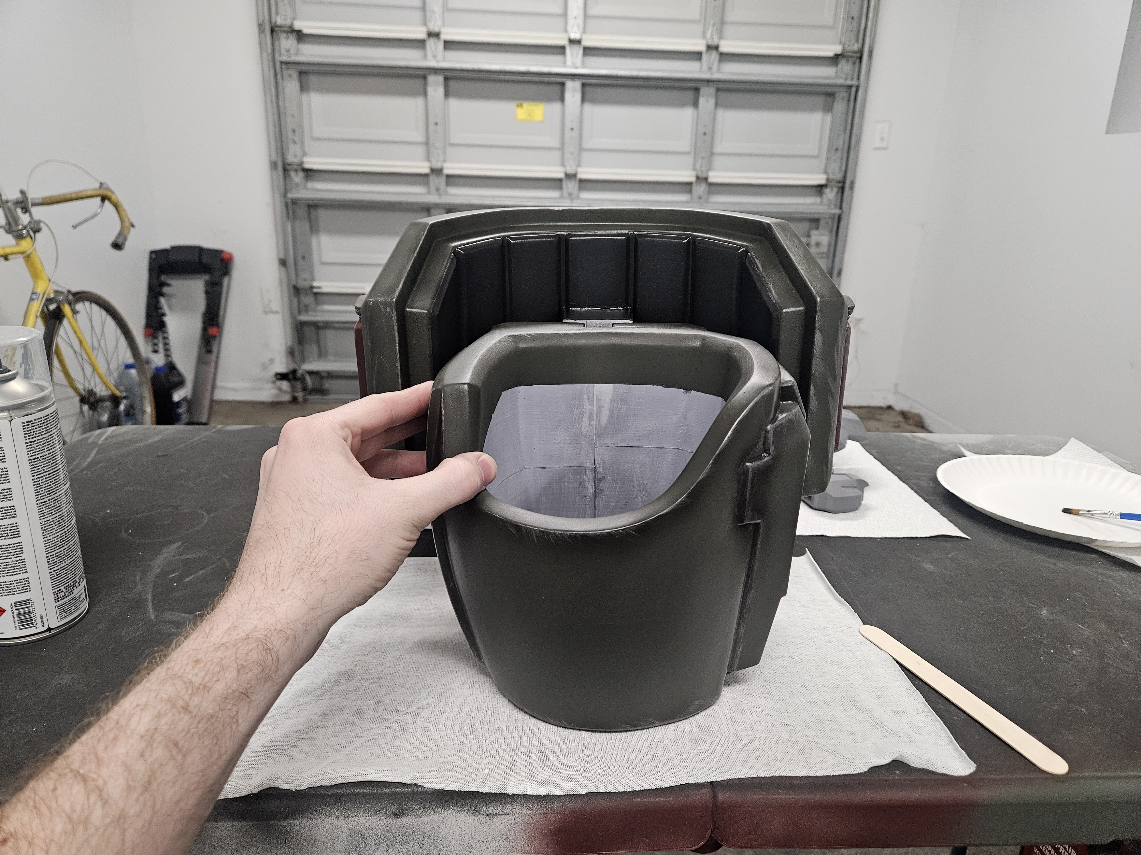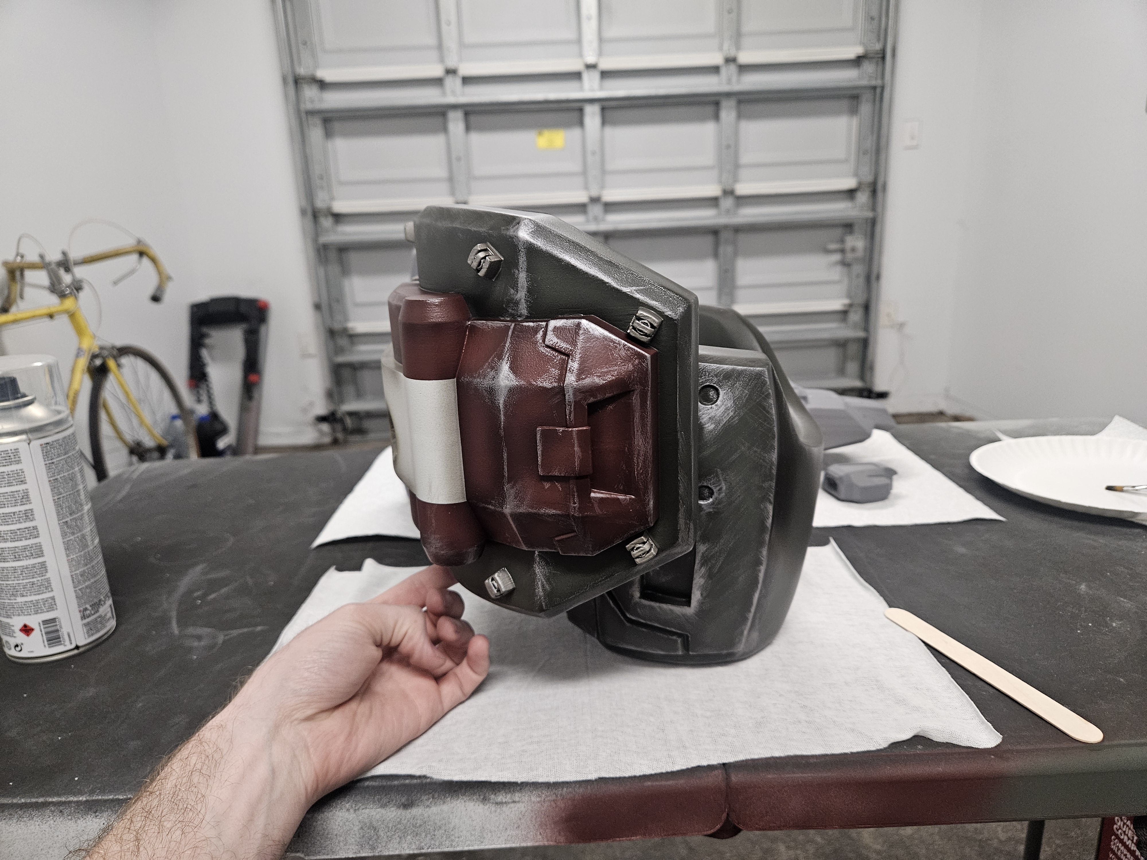 Current state of Jorge. I unfortunately had a major set back with the helmet paint job with the clear coat that I applied blushing out across the whole surface turning it almost entirely white. Moral of the story, don't chance painting in humidity. Had to sand the whole thing and restart.